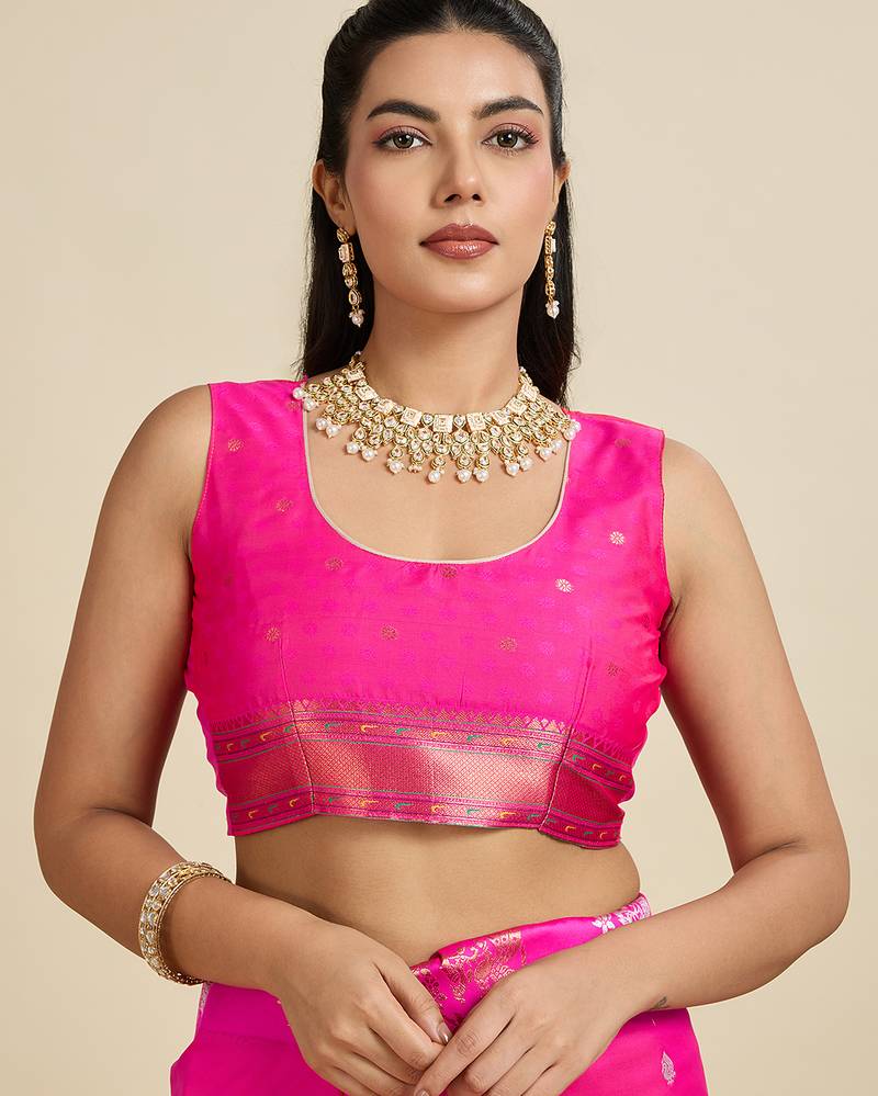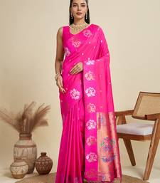 Pink paithani kanjivaram art silk saree with silver and gold zari weaving and running blouse piece