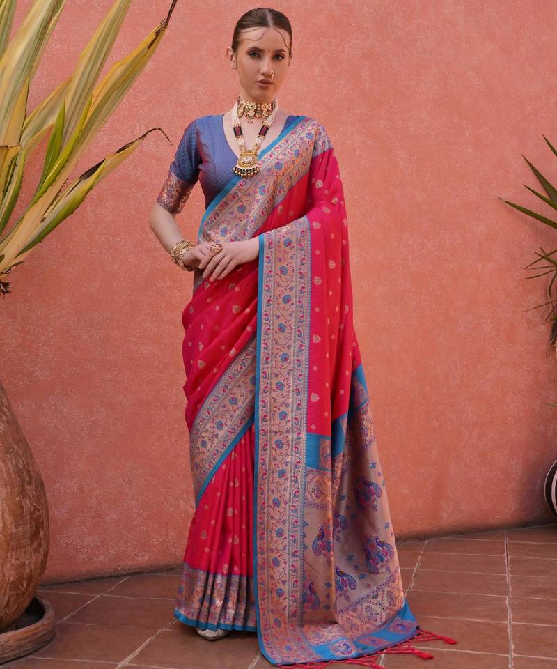 Pink paithani silk blend saree with elegant contrast border & fancy tassels | handwoven look designer saree with blouse