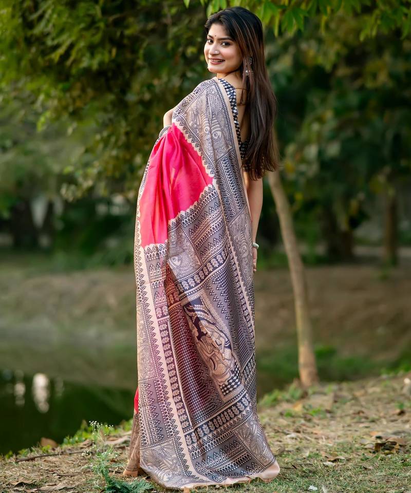 | Product Name | Pink Tussar Art Silk Madhubani Printed Saree With Traditional Pallu & Fancy Tassels – Contrast Blouse Piece Included | |