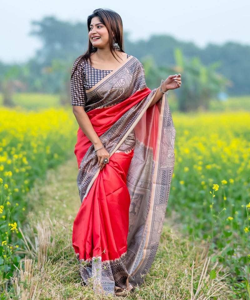 | Product Description | • Premium Tussar Silk Saree Featuring Intricate Madhubani Art Print For A Rich Ethnic Look