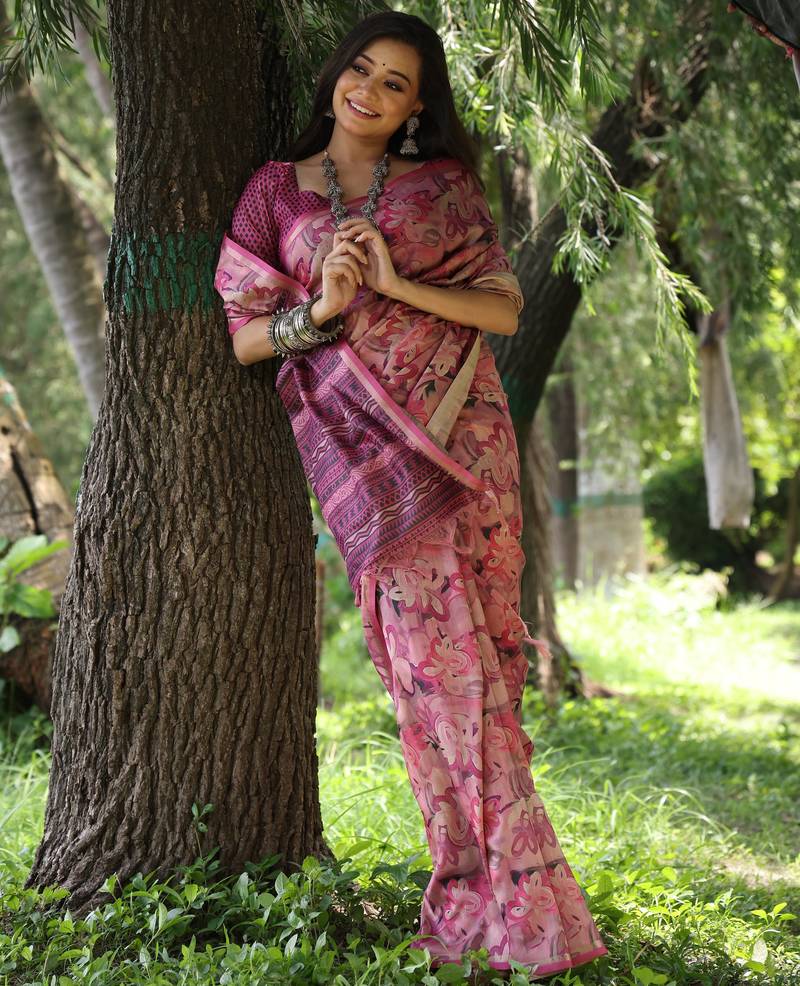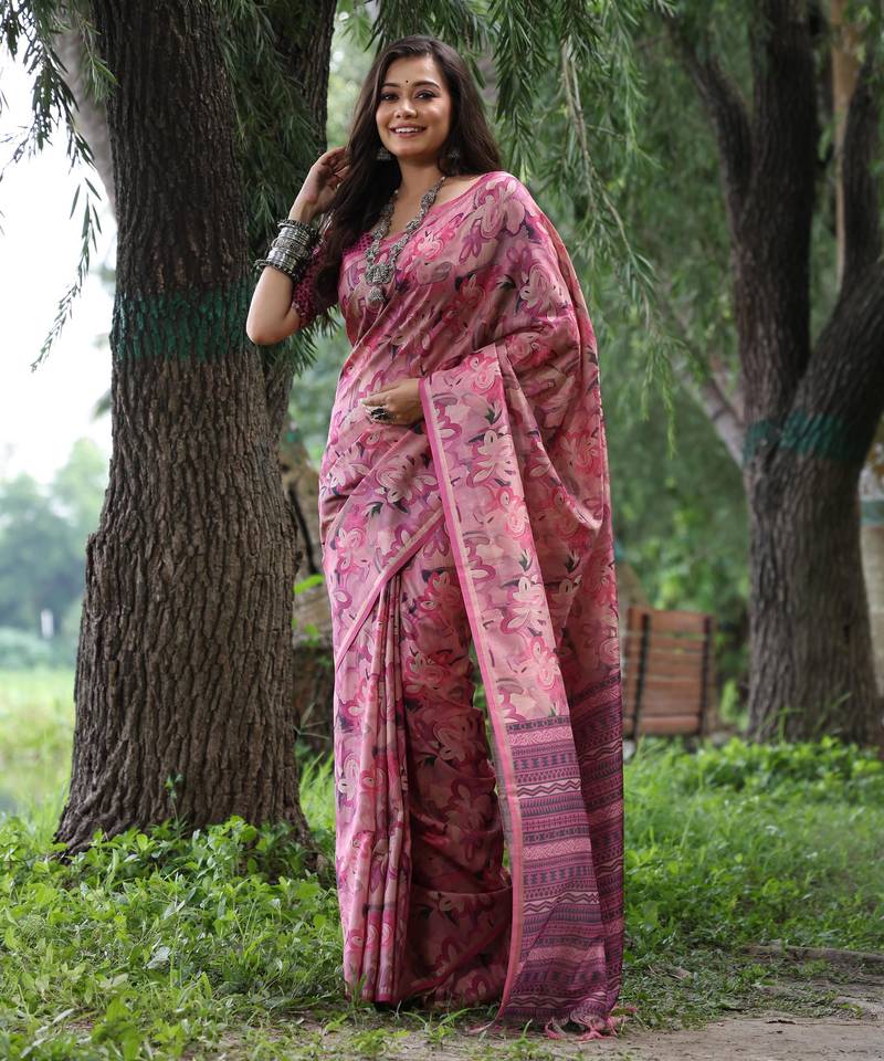 Pink tussar silk saree with hand-style printed design & zari border | printed pallu with tassels | running blouse piece