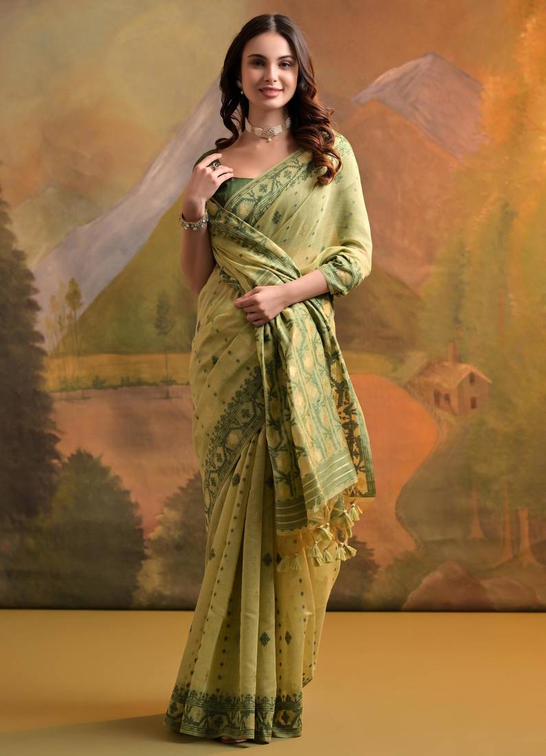 Pista green soft muga cotton jamdani saree with all over self weaving & contrast jal pallu with blouse