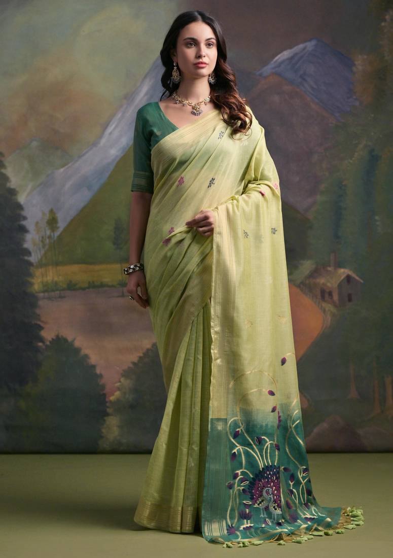 Product Name Pista Green Soft Muga Silk Blend Saree With Peacock Resham Weaving Pallu & Traditional Zari Border With Contrast Blouse