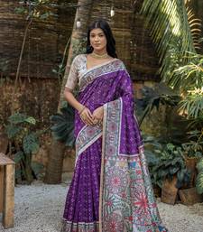 Purple madhubani printed tussar art silk saree with designer pallu & tassels | contrast blouse included