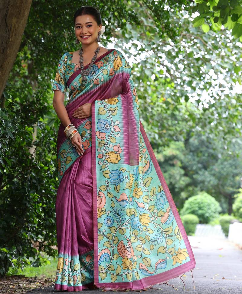 | Product Name | Reddish Pink Tussar Silk Kalamkari Printed Saree With Traditional Pallu & Temple Border | Tussar Silk Saree With Blouse | |