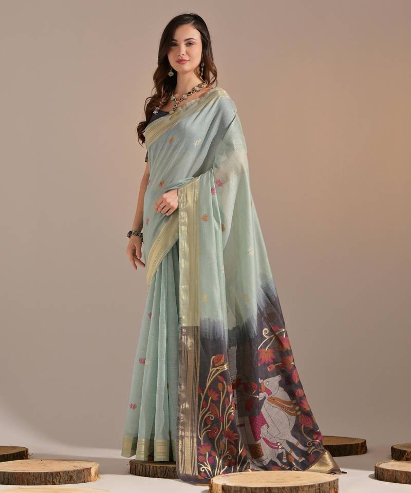 Sky blue muga cotton resham woven pichwai pallu saree with zari border & contrast blouse