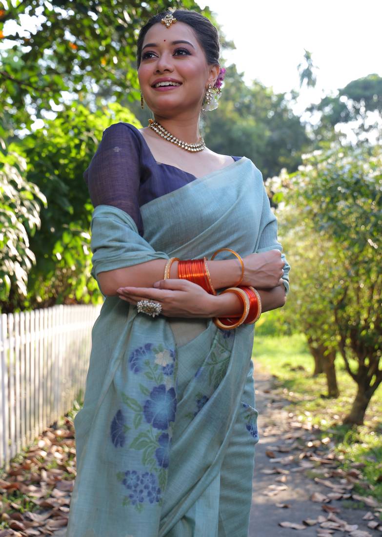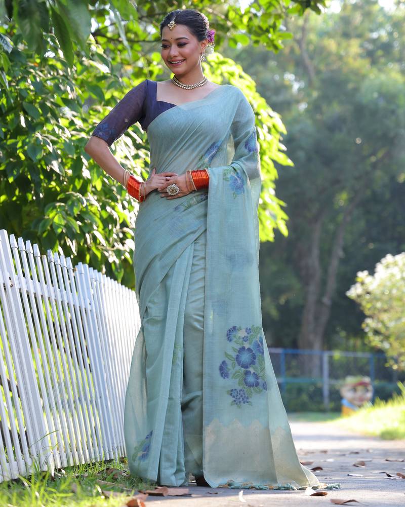 | Product Name | Sky Blue Soft Muga Cotton Resham Woven Saree With Jamdani Pallu, Zari Touch Up & Blouse – Traditional Weaving Design | |