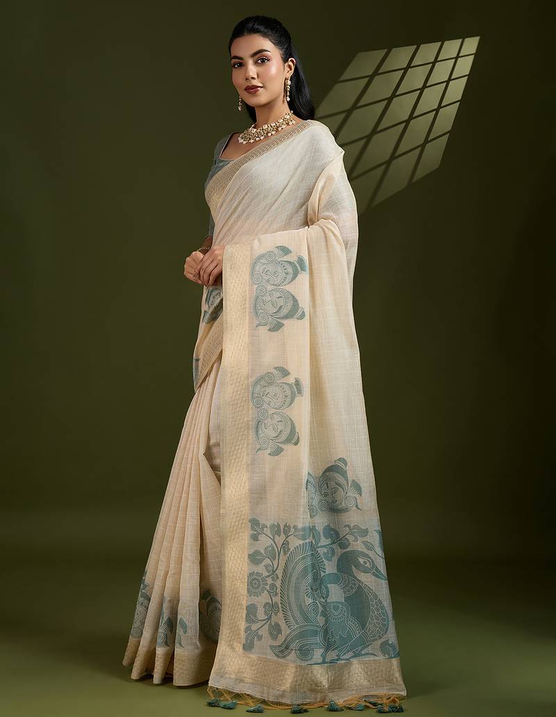 | Product Description | • Soft Muga Cotton Saree Featuring Traditional Kalamkari Peacock Weaving Pallu And Figure Motif Border.