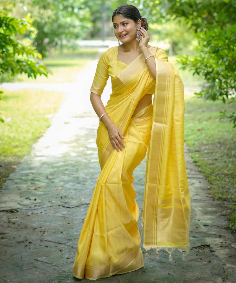 | Product Name | Yellow Banarasi Raw Silk Saree With Zari Lining Weaving, Premium Zari Border, Designer Pallu & Running Blouse | |
