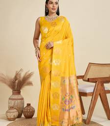 Yellow paithani kanjivaram art silk saree with silver and gold zari weaving and running blouse piece