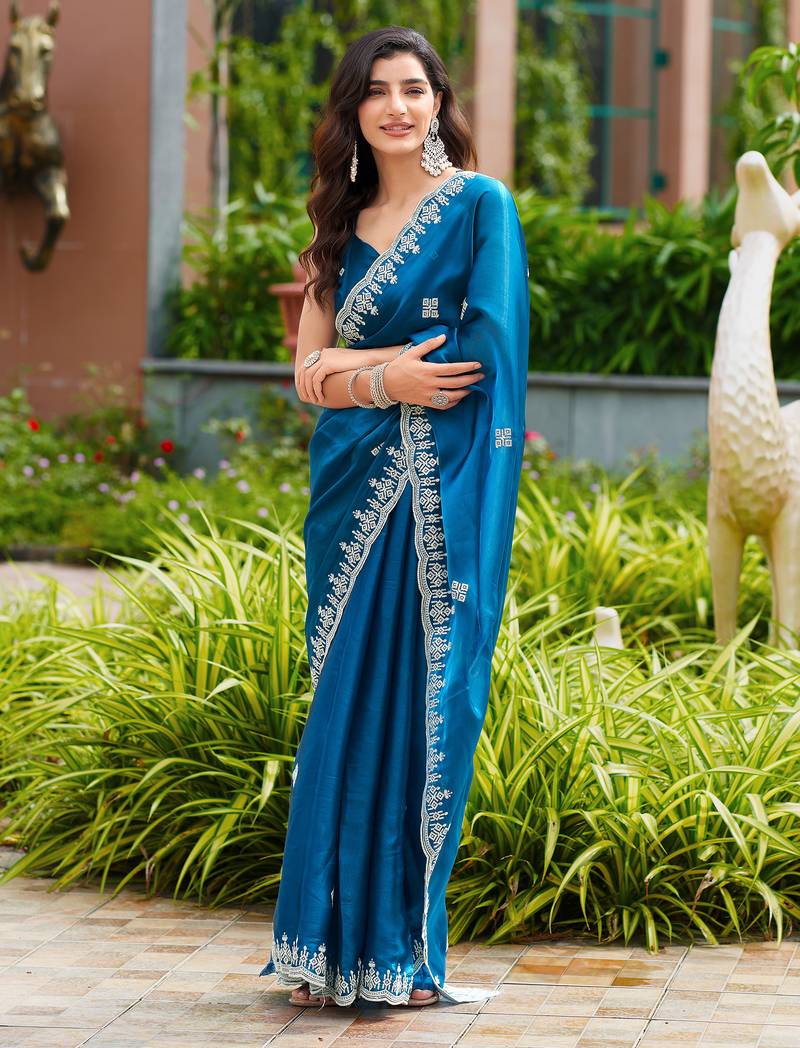 Embroidery work shimmer chiffon saree with unstitched blouse