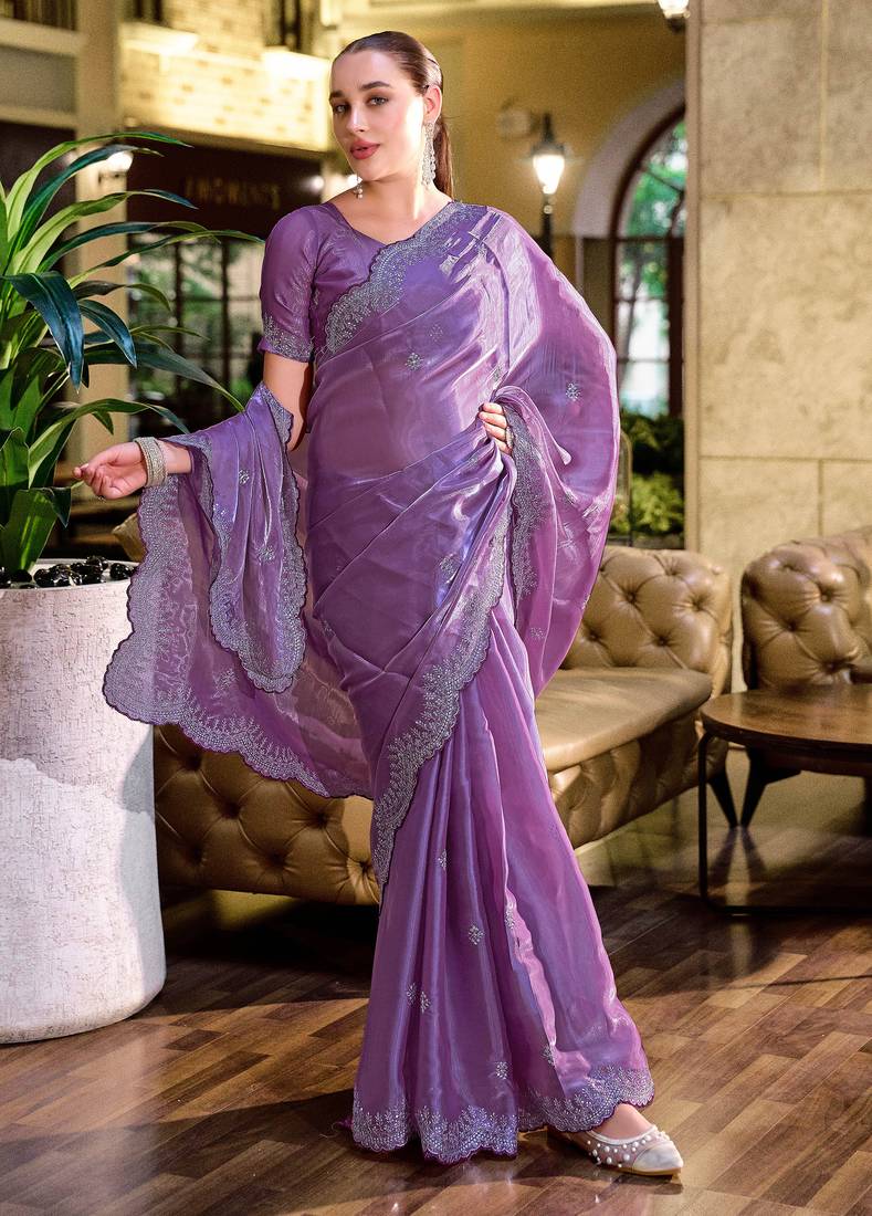 Lavender embroidery work shimmer chiffon saree with unstitched blouse