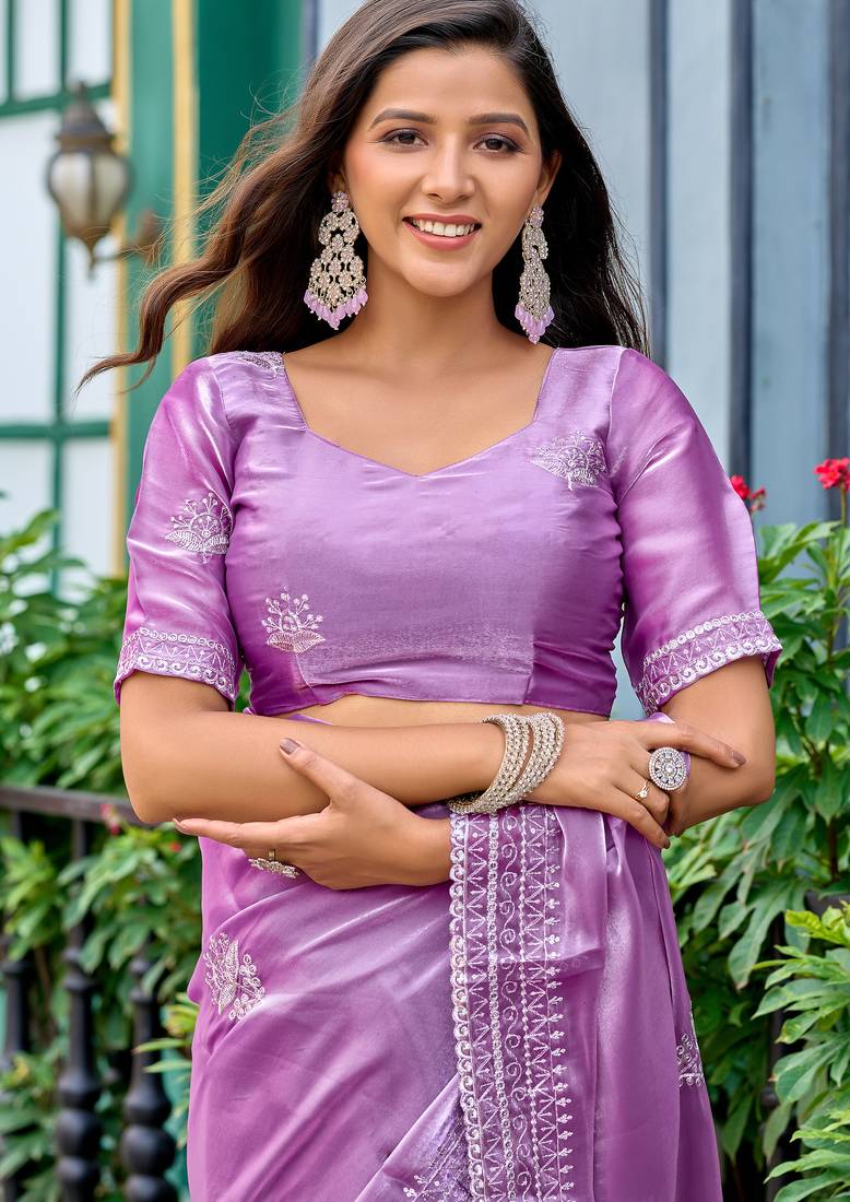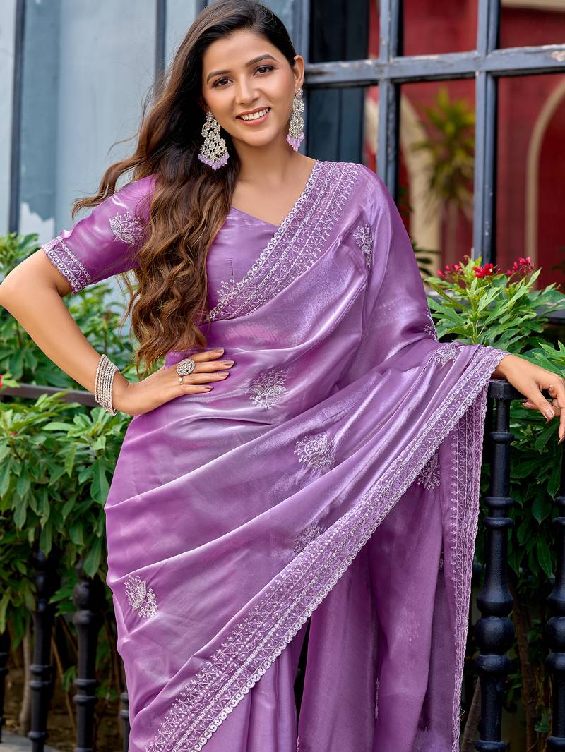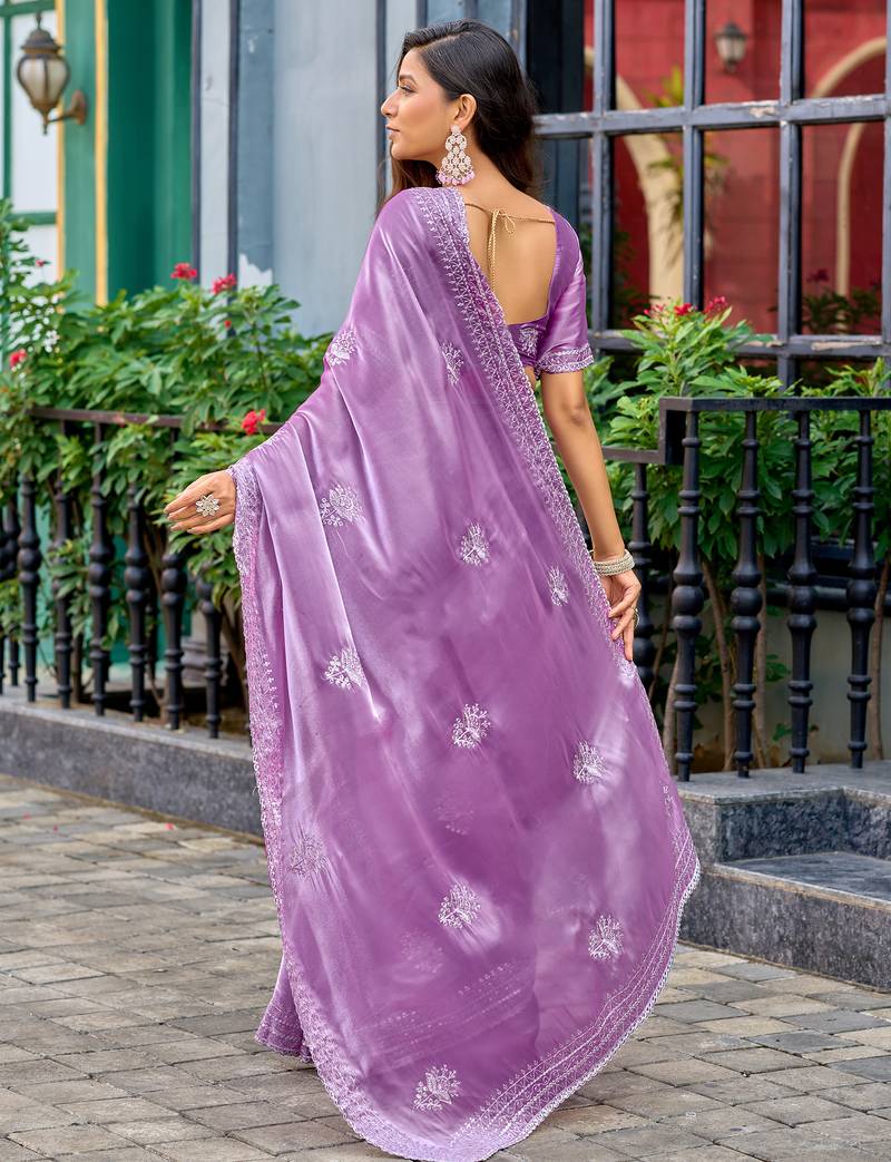 Lavender embroidery work shimmer chiffon saree with unstitched blouse