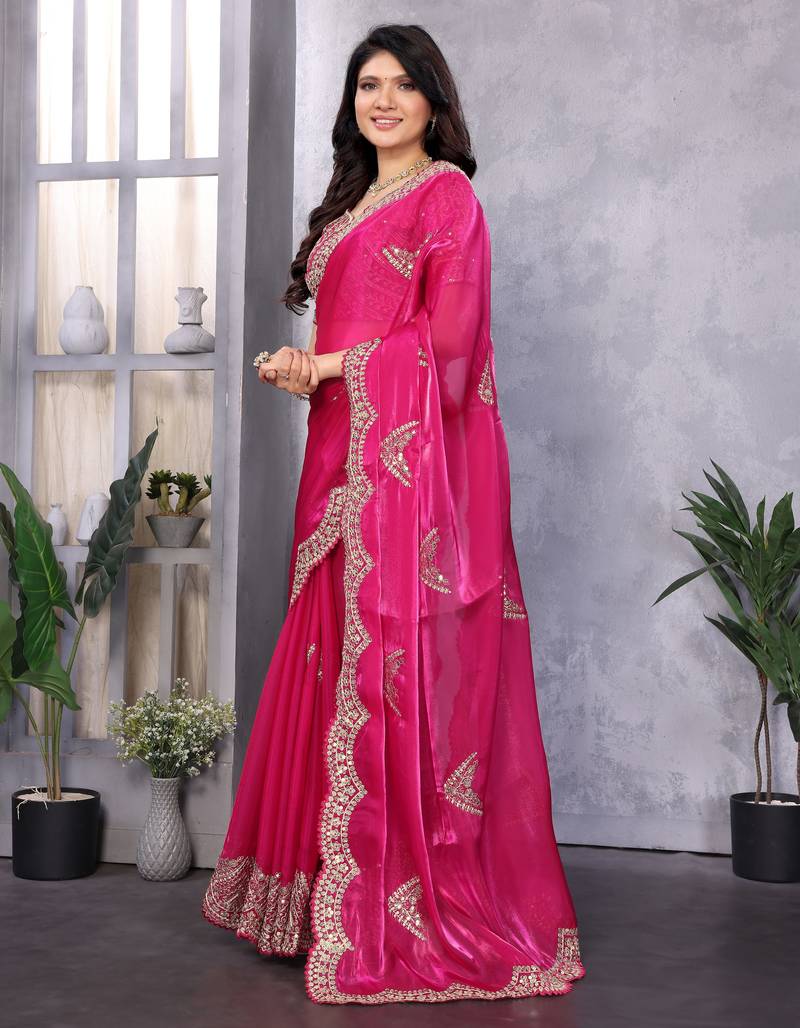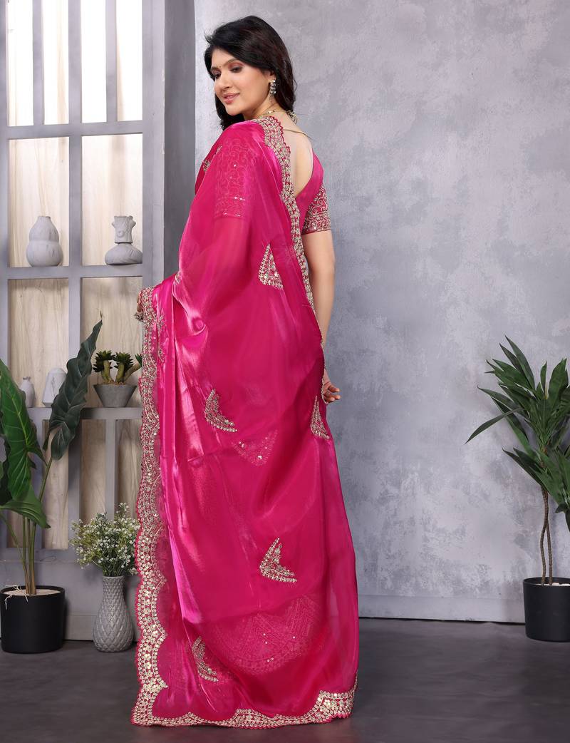 Pink embroidery work shimmer chiffon saree with unstitched blouse