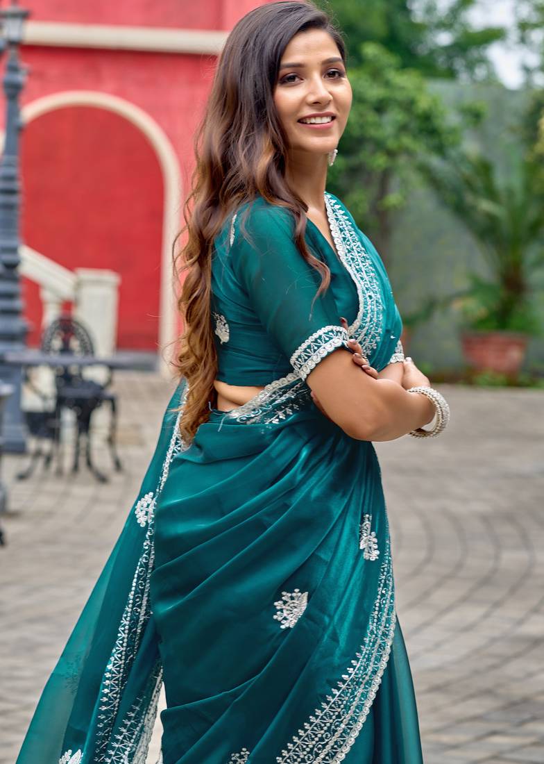 Rama embroidery work shimmer chiffon saree with unstitched blouse
