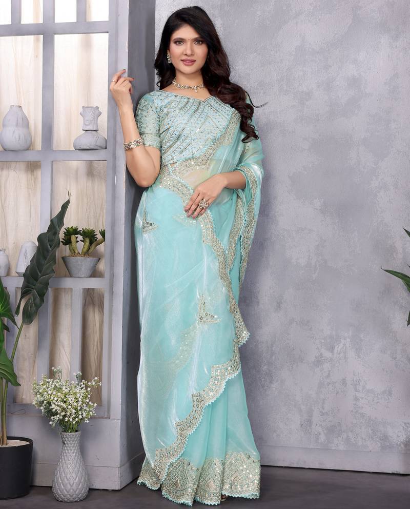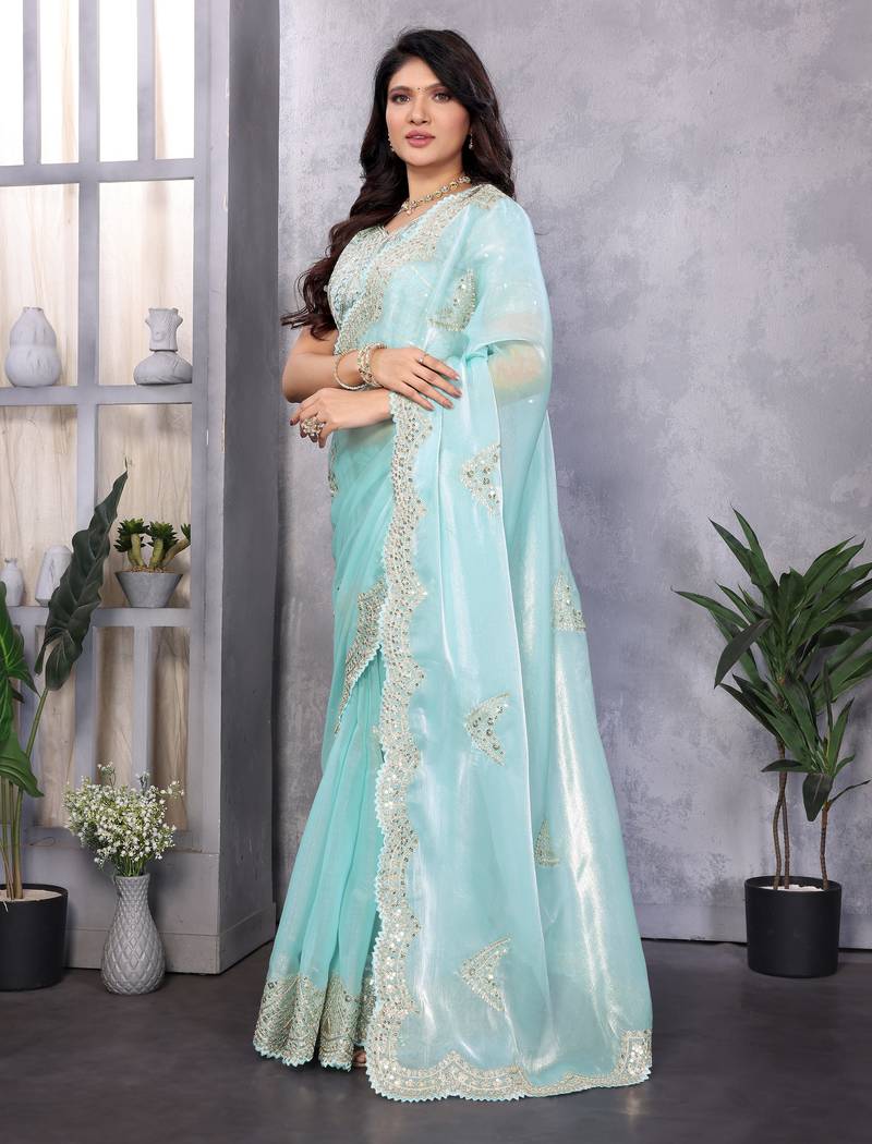 | Product Name | Sky Blue Embroidery Work Shimmer Chiffon Saree With Unstitched Blouse | |