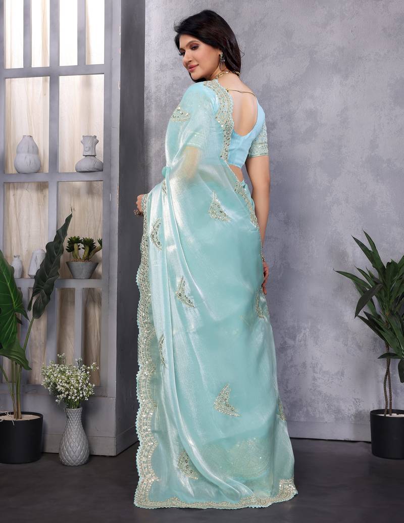 Sky blue embroidery work shimmer chiffon saree with unstitched blouse