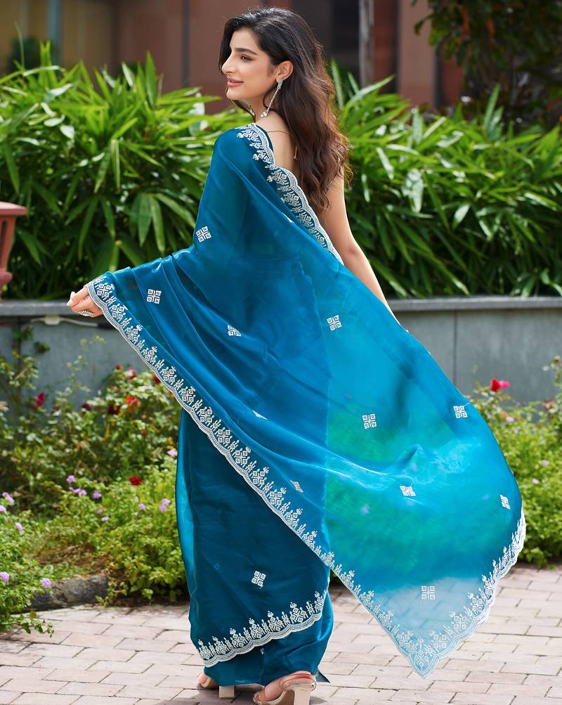 Product Name Teal Embroidery Work Shimmer Chiffon Saree With Unstitched Blouse