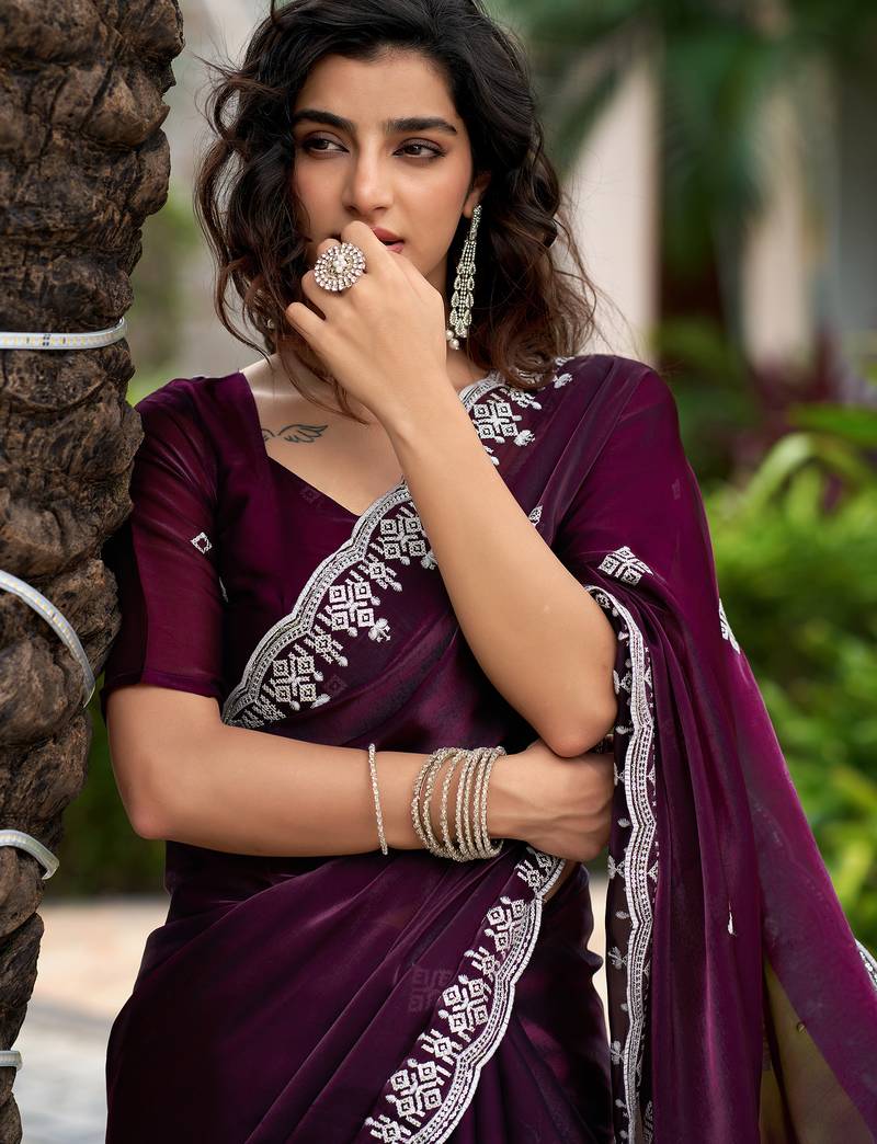 Product Name Wine Embroidery Work Shimmer Chiffon Saree With Unstitched Blouse