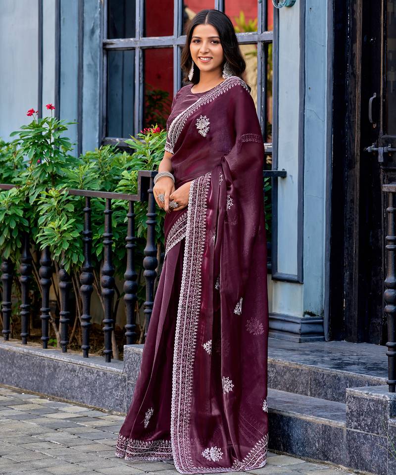 Wine embroidery work shimmer chiffon saree with unstitched blouse