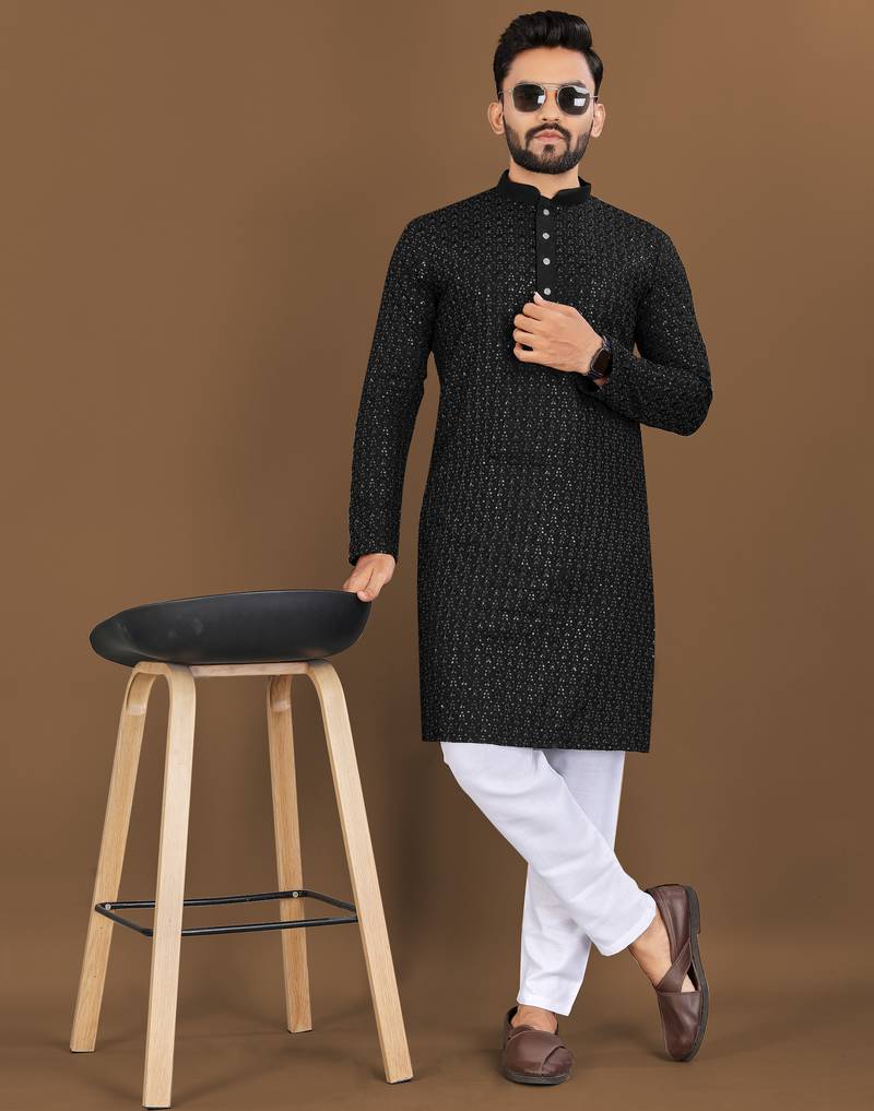 Elevate Your Ethnic Look With This Stylish Men's Kurta Pyjama Set. Made From Premium Rayon, The Kurta Is Beautifully Designed With Heavy Embroidery Enhanced By Shimmering Sequins, Creating A Perfect Blend Of Elegance And Tradition. Paired With A Comfortable Cotton Pajama, This Outfit Is Ideal For Weddings, Festive Occasions, And Cultural Events.