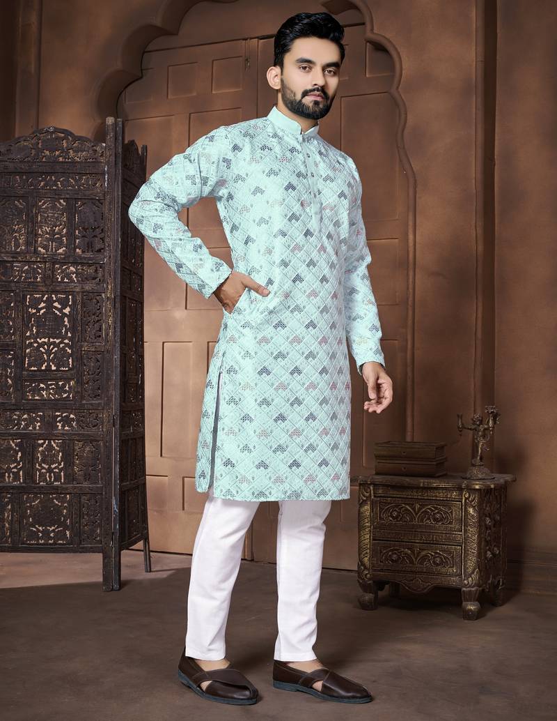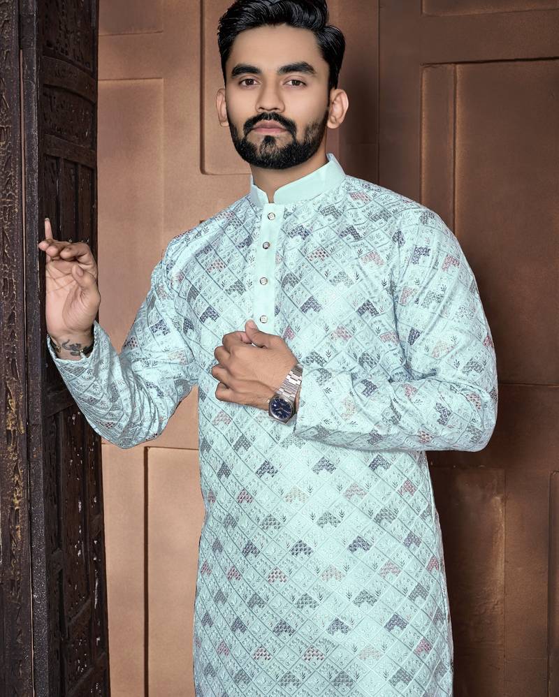 | Product Name | Sky Blue Embroidered Italian Silk Kurta Set For Men | |