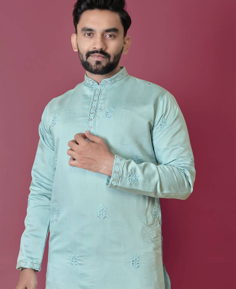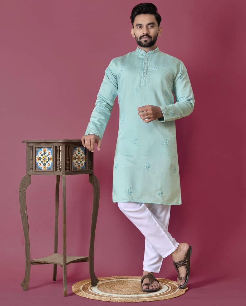 | Product Description | Sky Blue Embroidered Roman Silk Kurta Set For Men Discover Elegance Redefined With Our Sky Blue Embroidered Roman Silk Kurta Set For Men, A Perfect Blend Of Traditional Charm And Modern Style. Meticulously Crafted From Premium Kurta Set For Men Fabric |