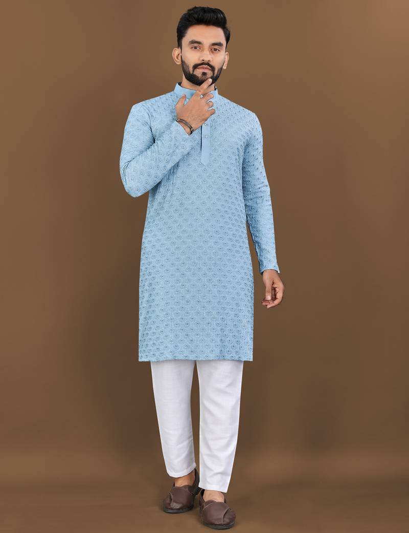 Sky blue rayon embroidered sqeuence work kurta pajama set
