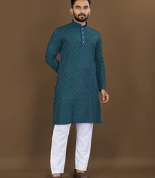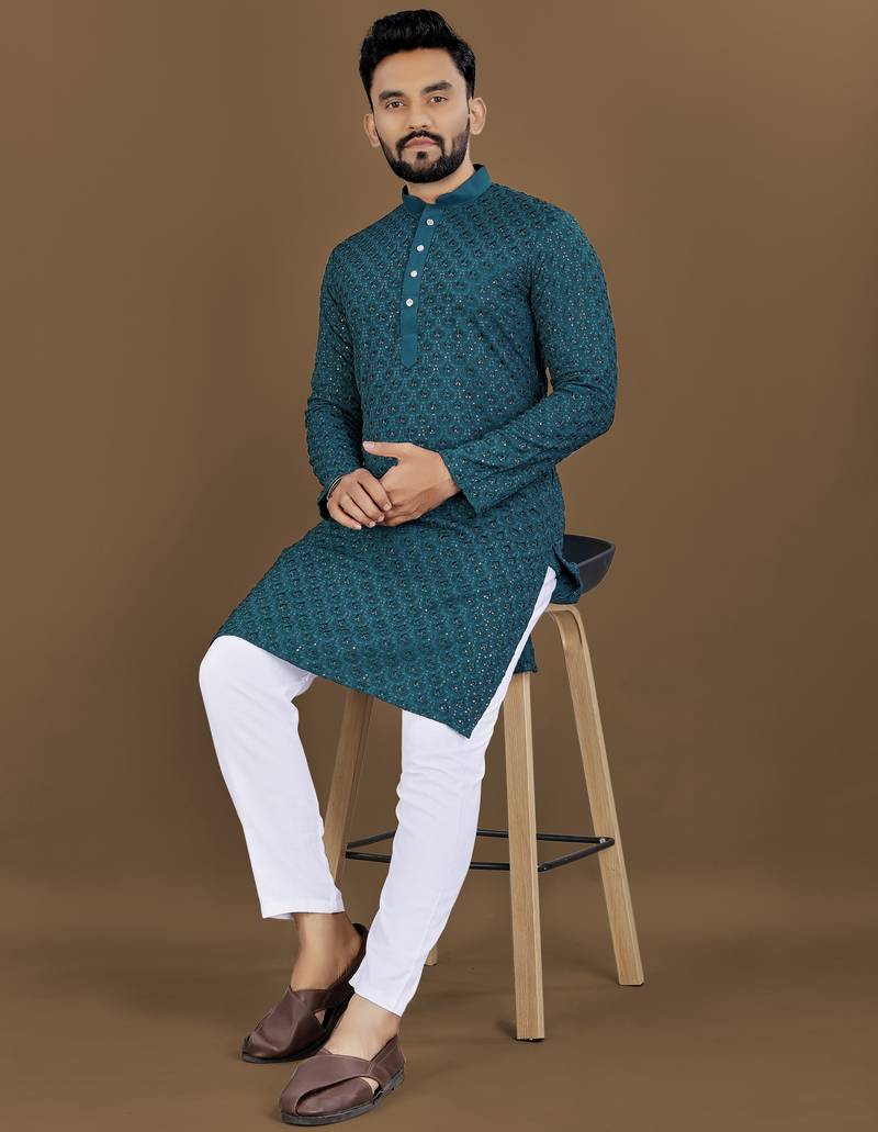Teal blue rayon embroidered sqeuence work kurta pajama set