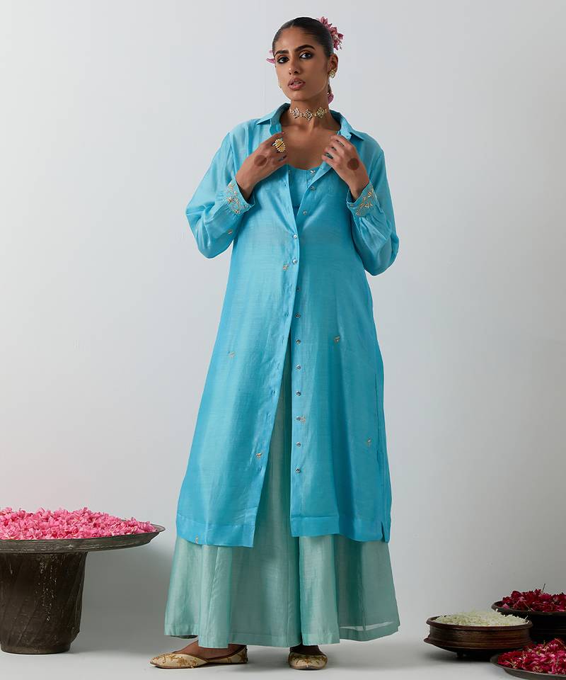 This Blue Plain Chanderi Co Ord Set Combines Minimal Elegance With Modern Style. Crafted From Soft, Lightweight Chanderi Fabric, It Offers A Subtle Sheen And A Refined Silhouette. Perfect For Festive Gatherings, Casual Celebrations, Or Daytime Events, This Coordinated Ensemble Delivers Effortless Sophistication With A Comfortable And Contemporary Appeal.