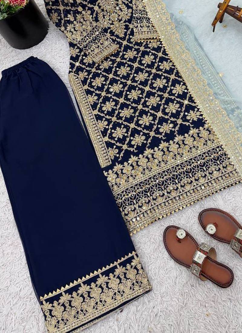| Product Description | This Appears To Be A Navy Blue Straight Cut Suit Set With Extensive Gold Toned Embroidery, Typically Referred To As A Punjabi Or Pakistani Style Suit In South Asian Ethnic Wear. The Intricate Zari Or Thread Work Forms Geometric And Floral Motifs Across The Kurta (Tunic) And The Hem Of The Matching Trousers. |