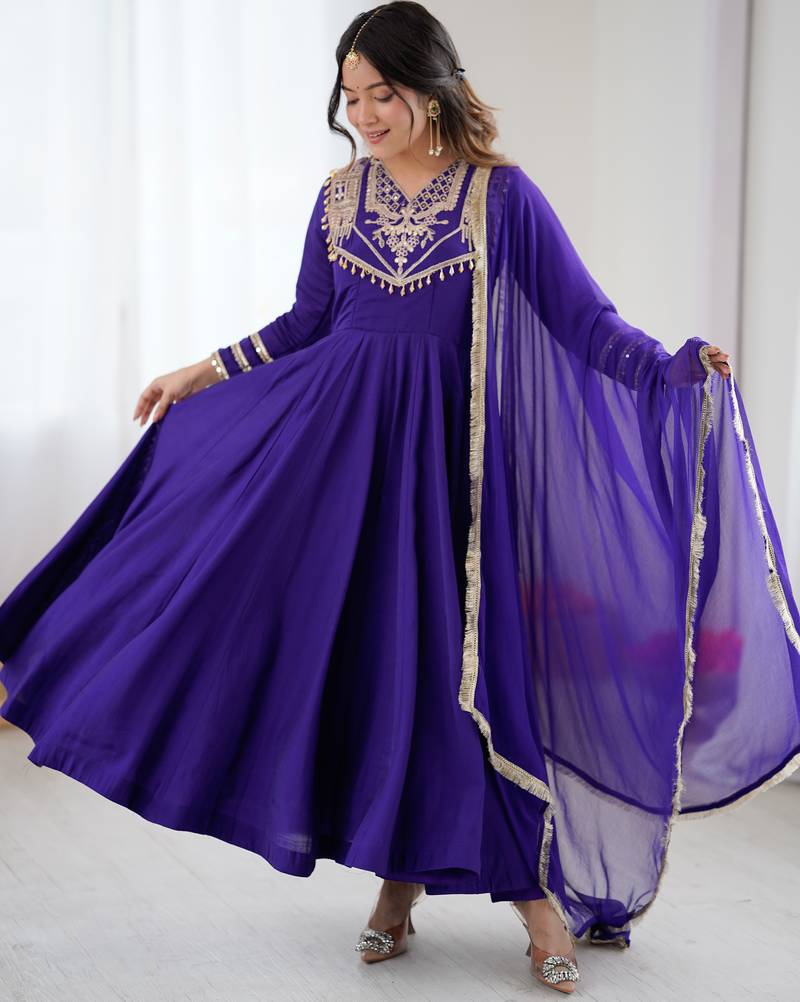 | Product Description | This Exquisite Anarkali Ensemble Is Designed For Grand Occasions, Featuring A Rich, Purple Color And Intricate Traditional Work. |