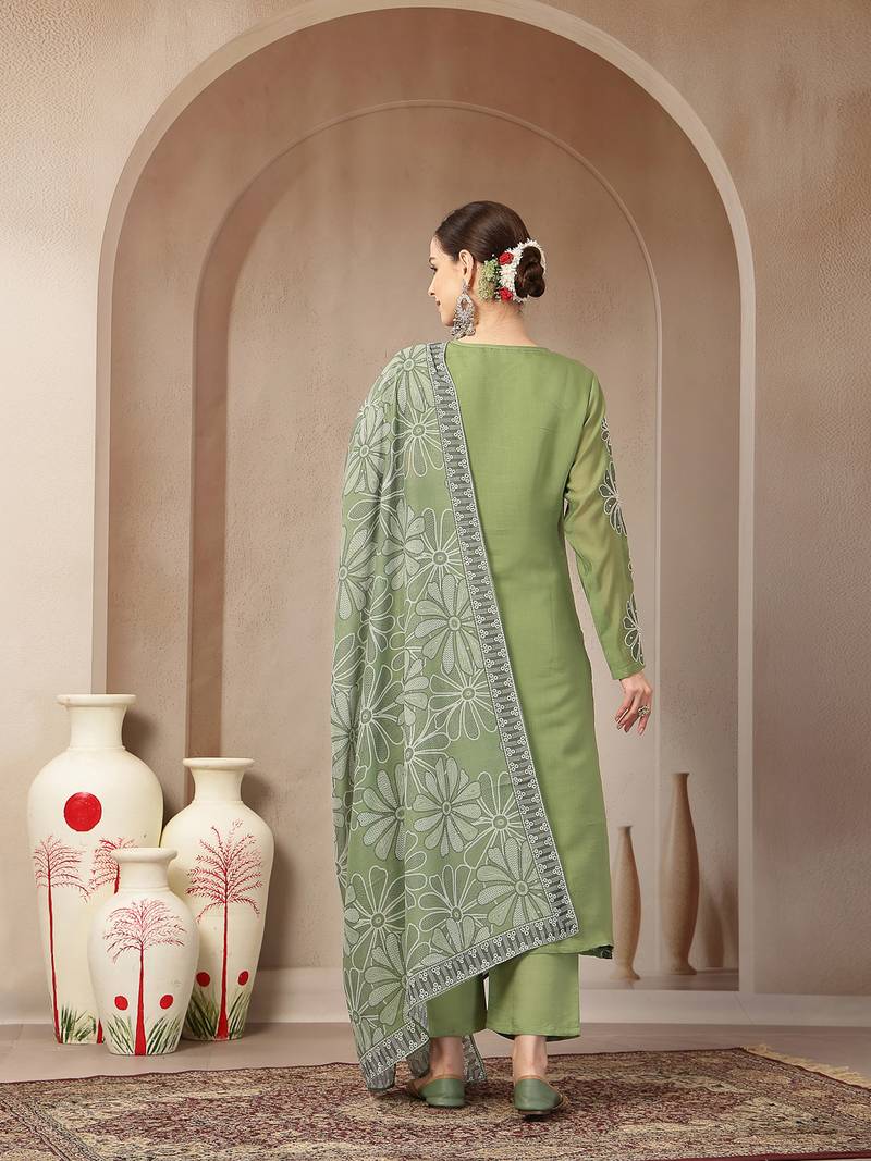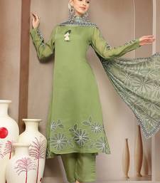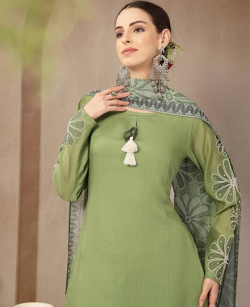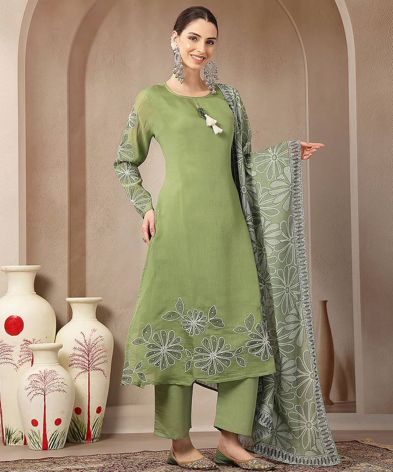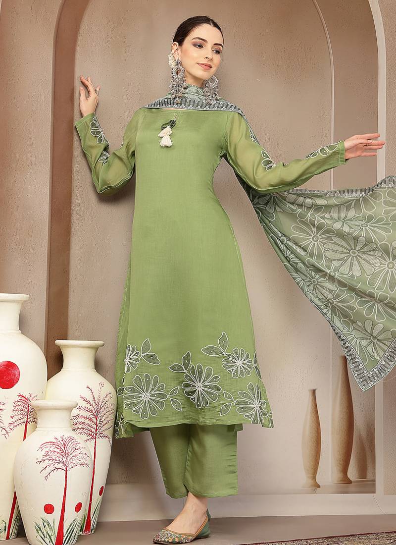 | Product Name | Green Mul Chanderi Silk Keyhole Neck A Line Kurta Trouser Dupatta Set | |