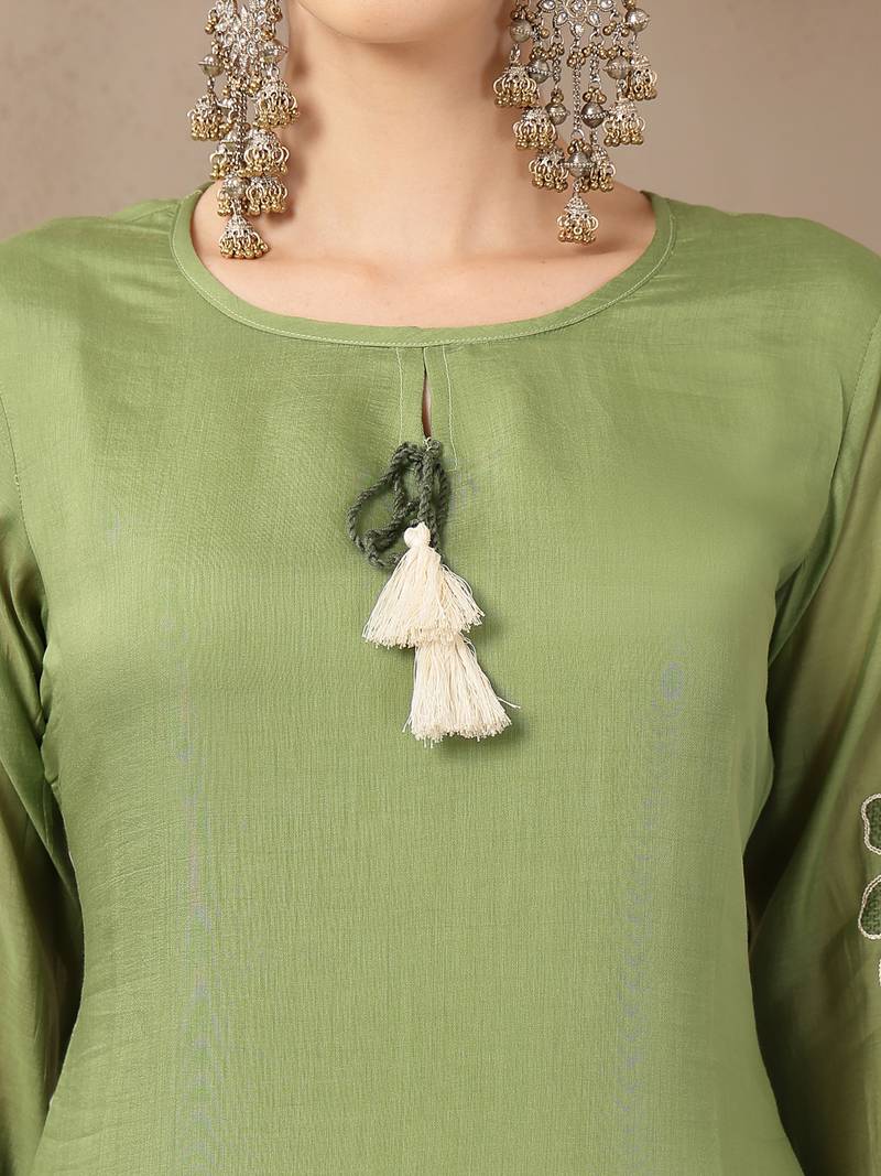 Green mul chanderi silk keyhole neck a-line kurta trouser dupatta set