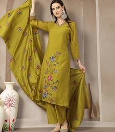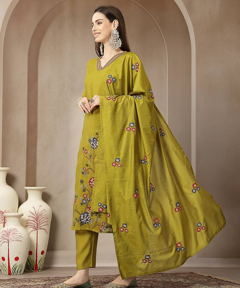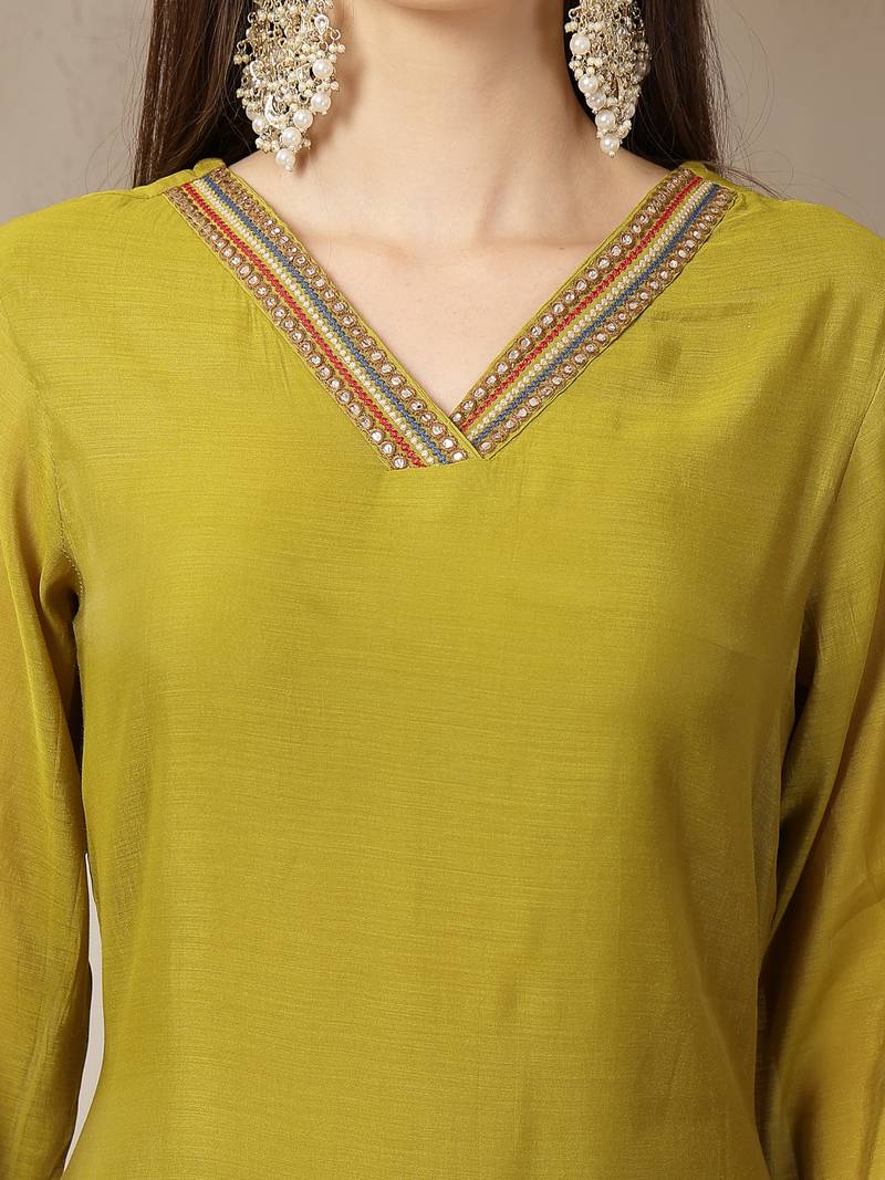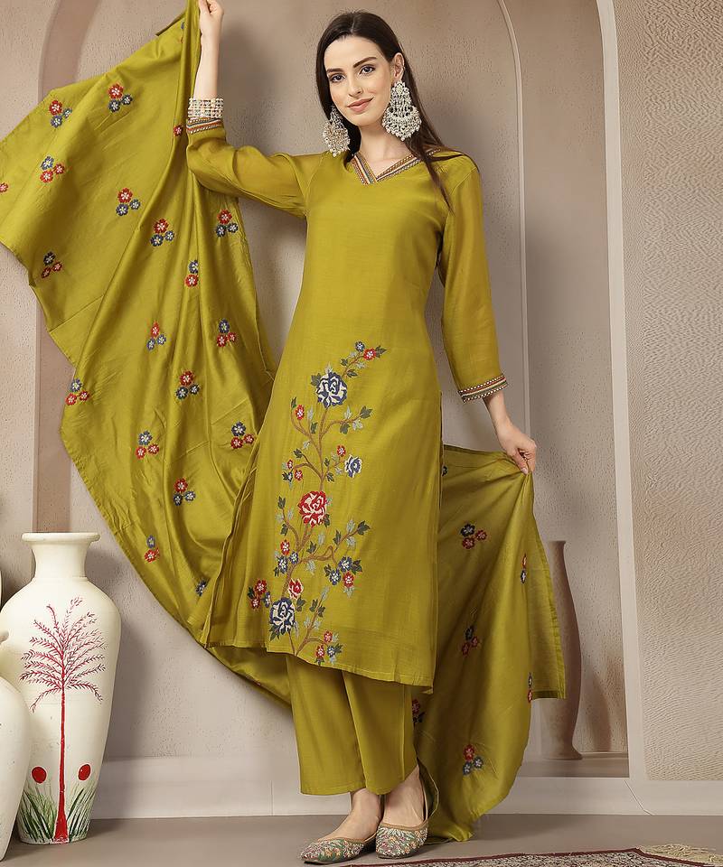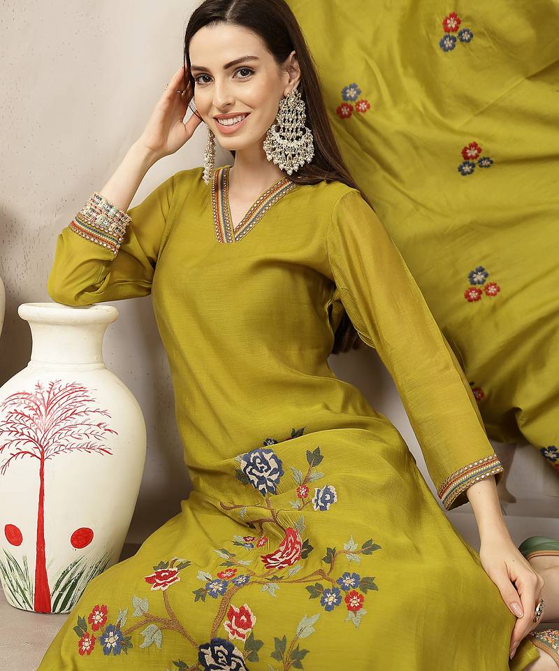 | Product Name | Lime Green Mul Chanderi Embroidery A Line Kurta Trouser Dupatta Set | |