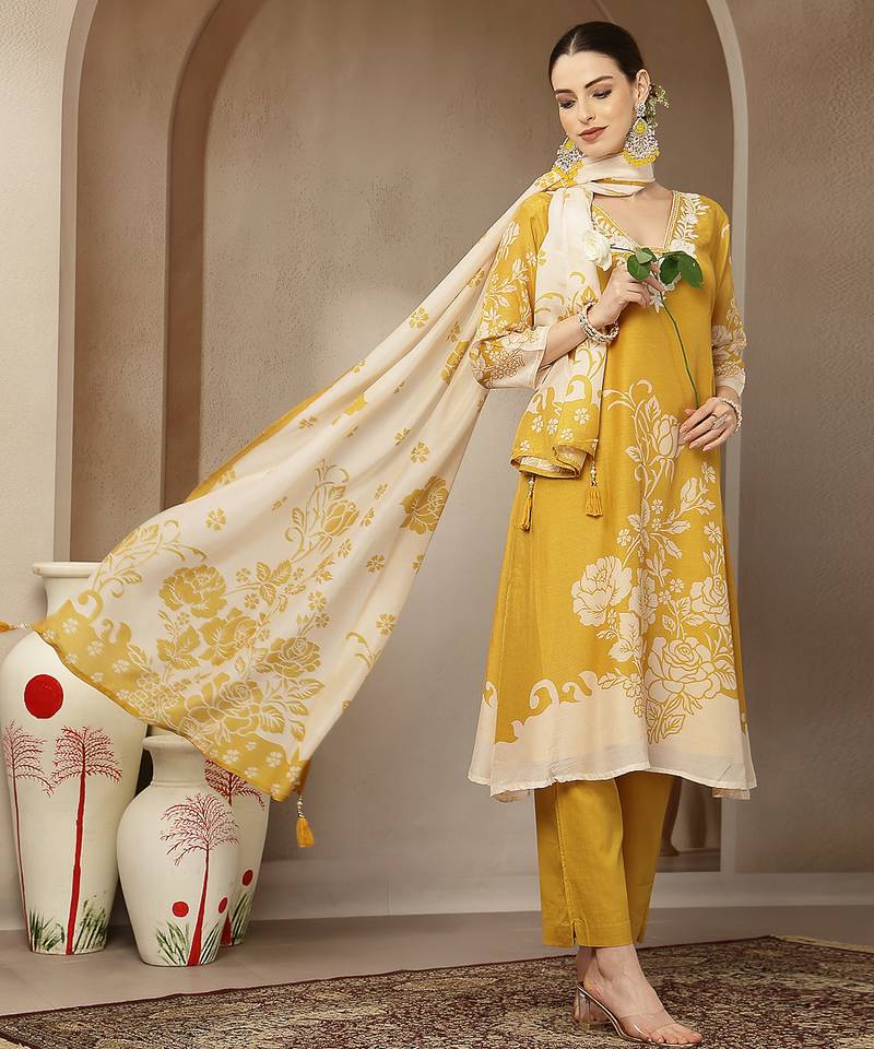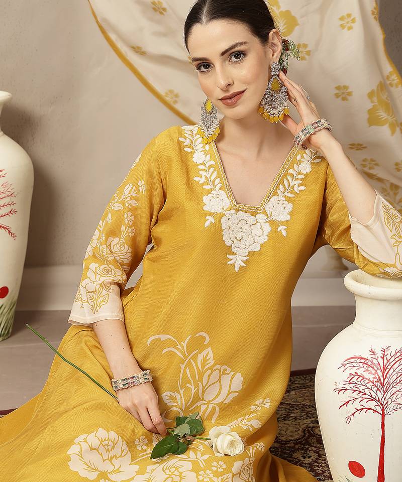 | Product Description | Yellow Chanderi Silk Floral A Line Kurta Trouser Dupatta Set Kurta Design A Line Shape Floral Thread Work Have A Lining Three Quarter Sleeve Round Neck Calf Length Kurta Flared Him Machine Weave Silk Blend Trouser Design: Purple Silk Blend Trouser Slip On Waist Size & Fit Material & Care Silk Blend |