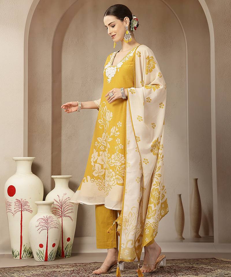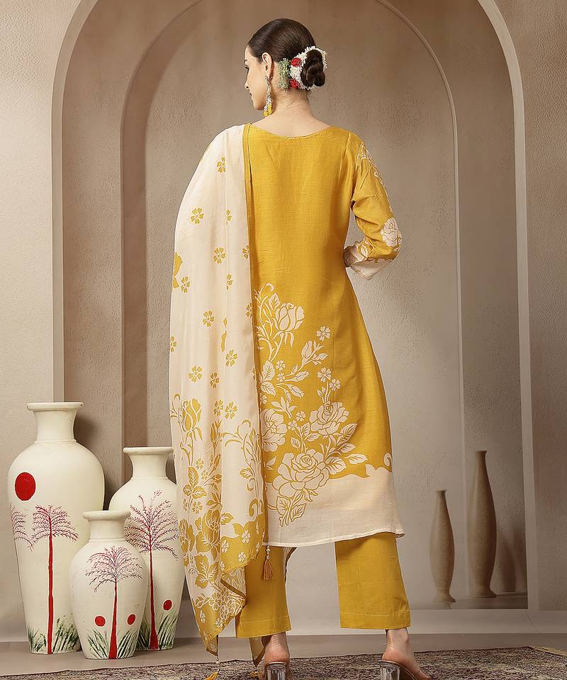 | Product Name | Mul Chanderi Yellow Kurta Dupatta Pant Set | |