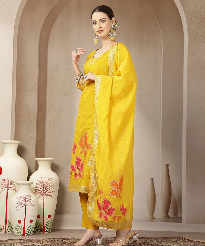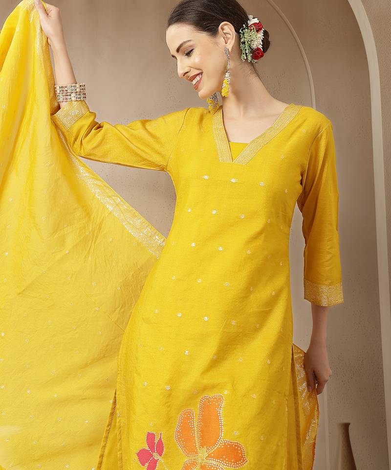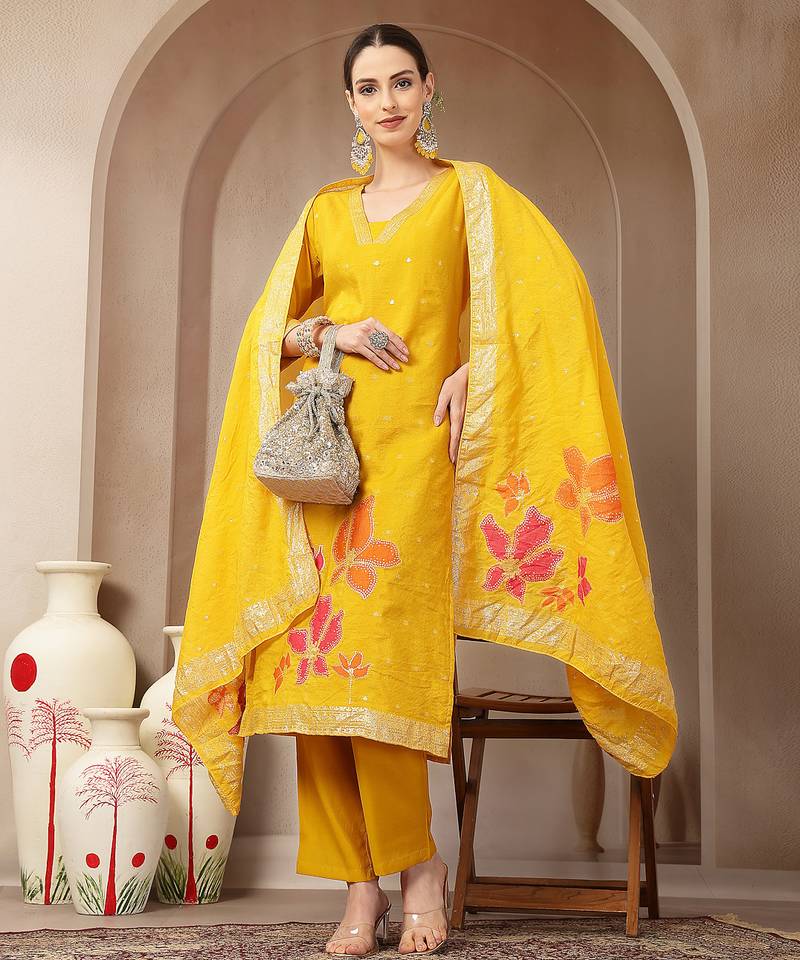 | Product Name | Mustard Chanderi Silk Straight Kurta Trouser Dupatta Set | |