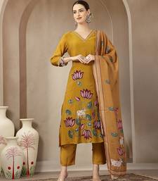Mustard mul chanderi silk floral a-line kurta trouser dupatta set
