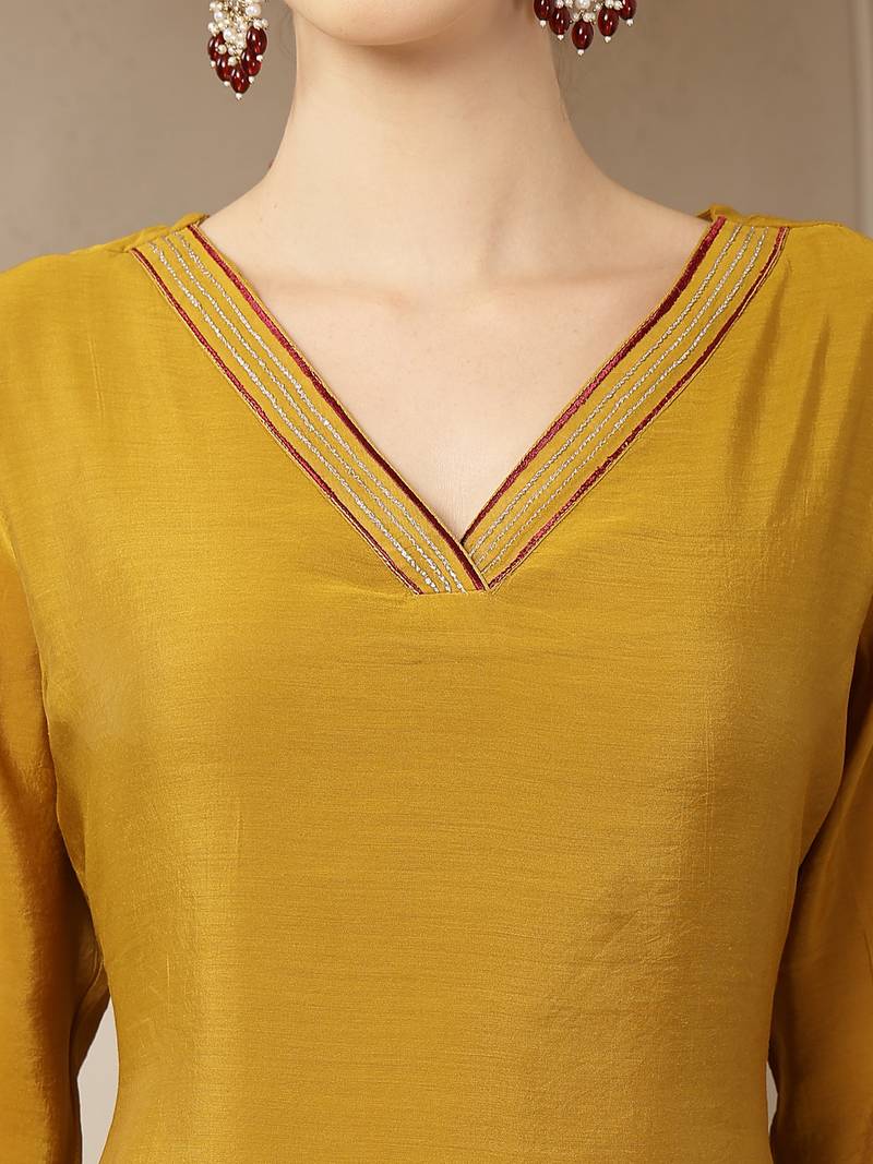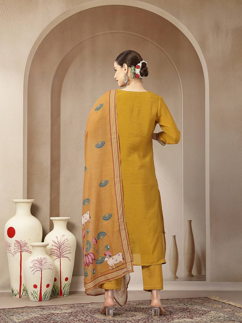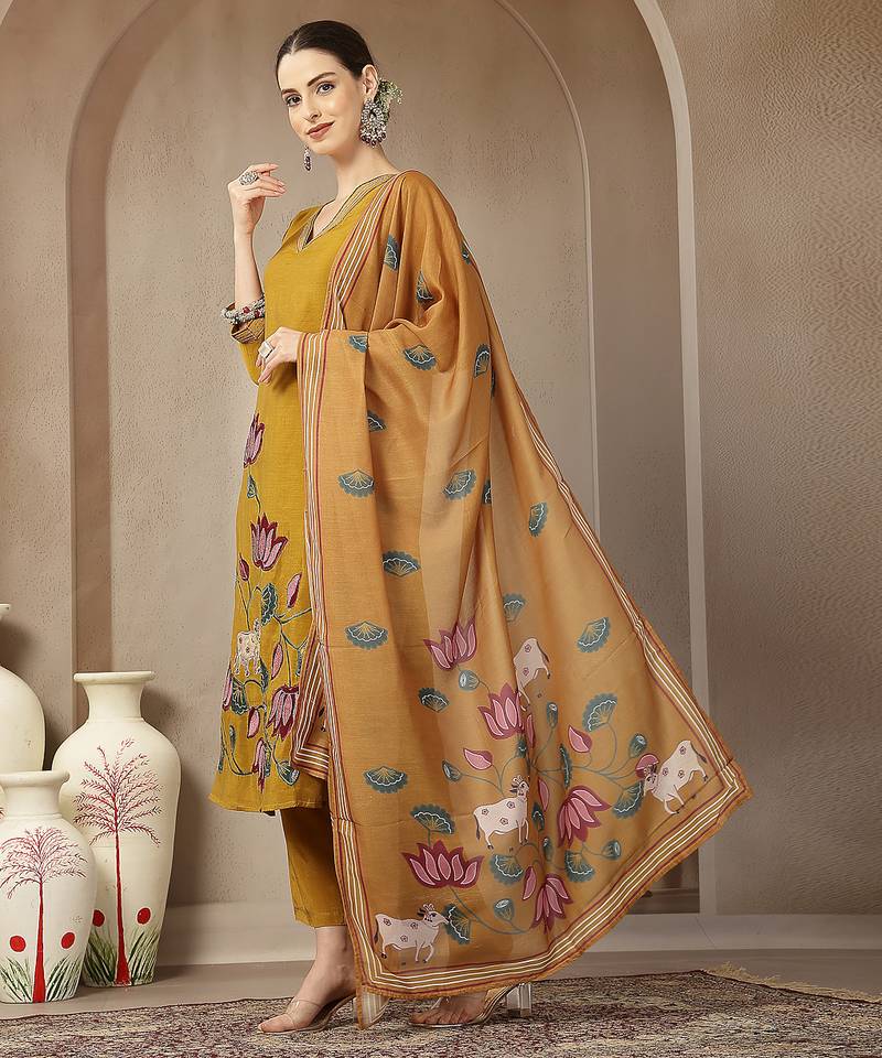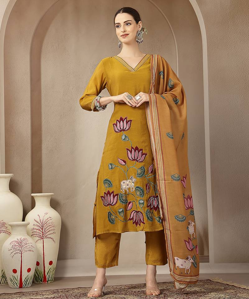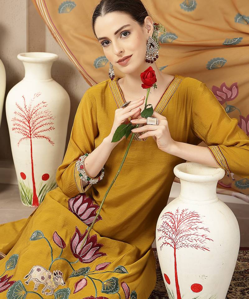 | Product Name | Mustard Mul Chanderi Silk Floral A Line Kurta Trouser Dupatta Set | |