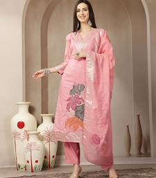 Peach chanderi silk floral straight kurta trouser dupatta set