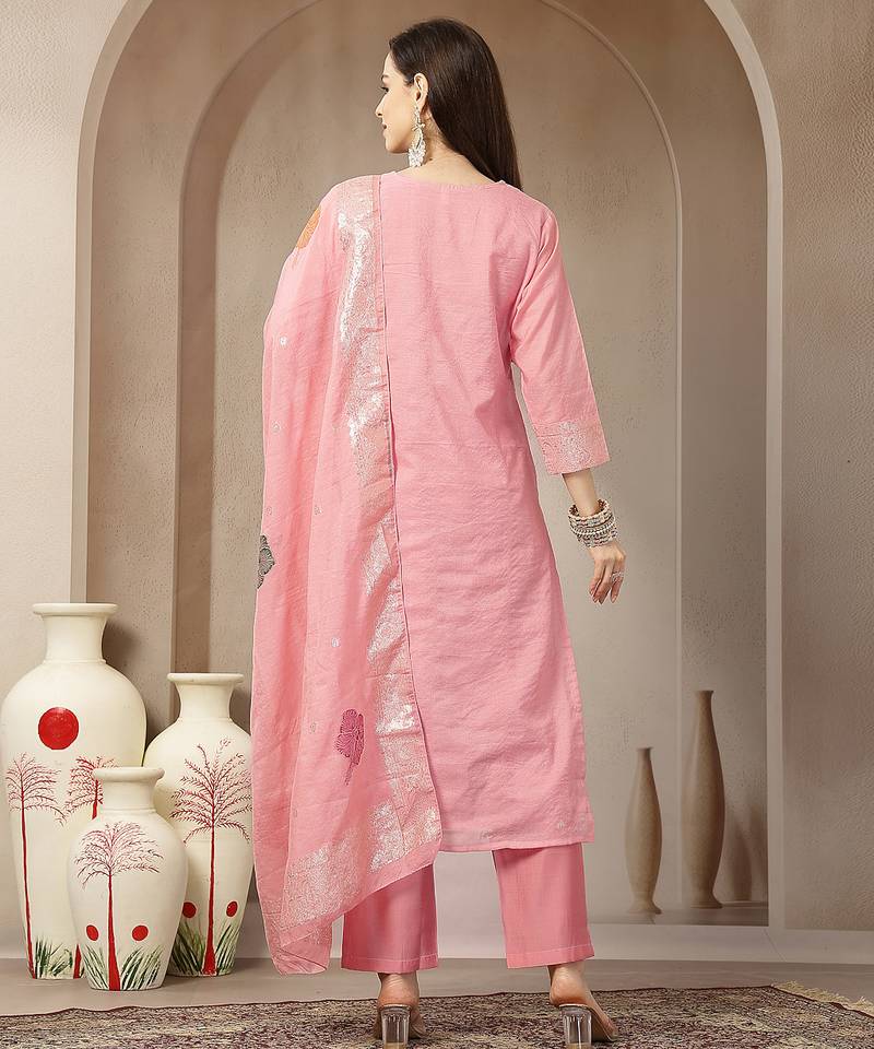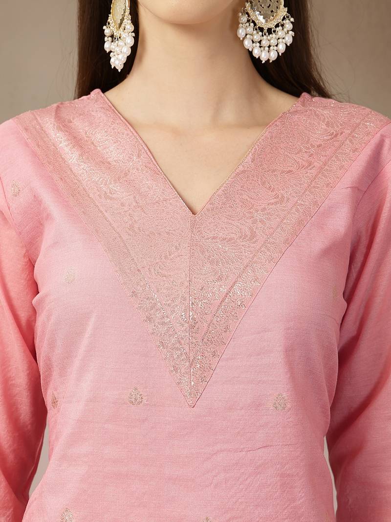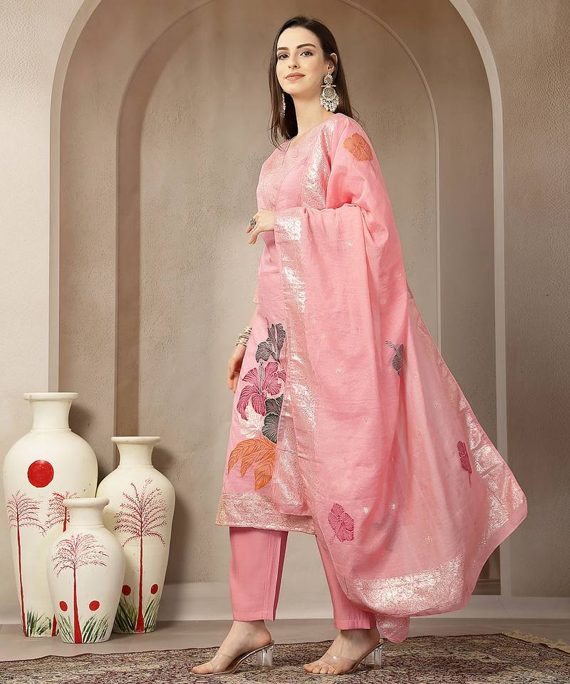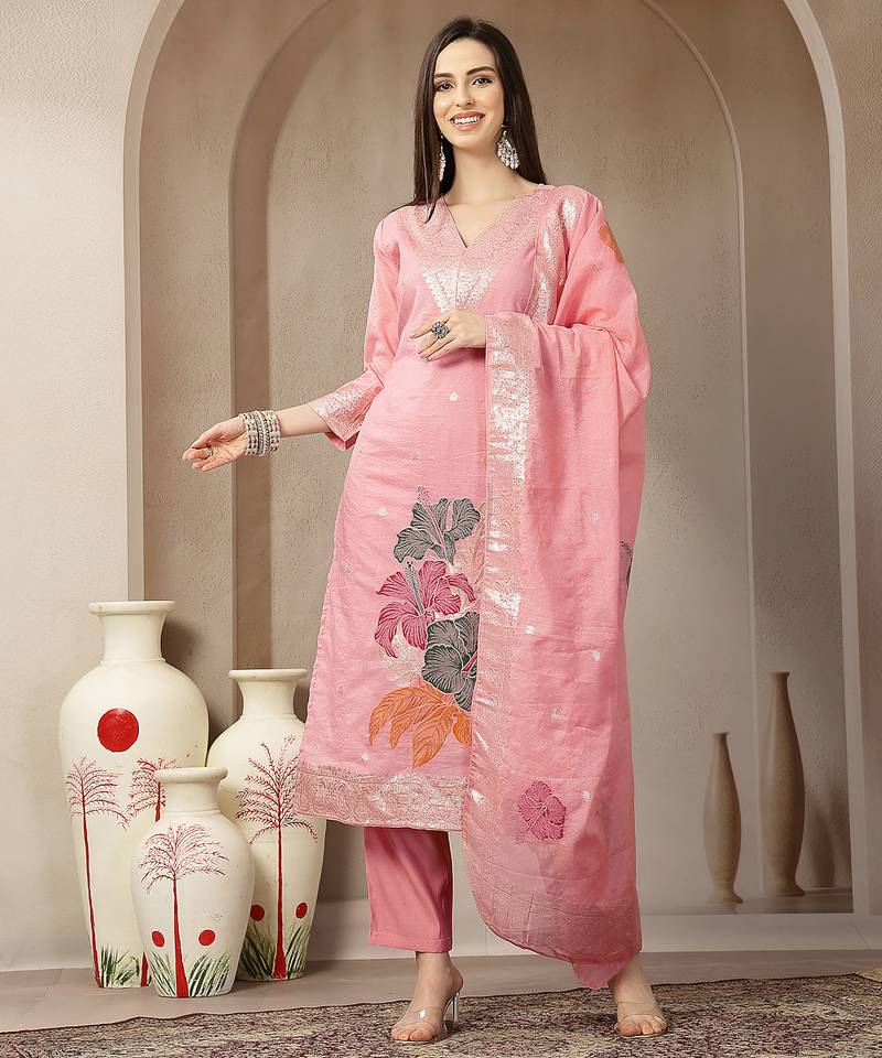 | Product Name | Peach Chanderi Silk Floral Straight Kurta Trouser Dupatta Set | |