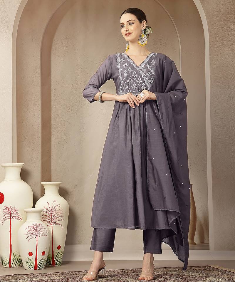 Purple Chanderi Silk Embroidery Anarkali Kurta Trouser Dupatta Set Kurta Design Anarkali Shape Beads And Stones,Mirror Work Have A Lining Three Quarter Sleeve V Neck Calf Length Kurta Flared Him Machine Weave Silk Blend Trouser Design: Purple Silk Blend Trouser Slip On Waist Size & Fit Material & Care Silk Blend