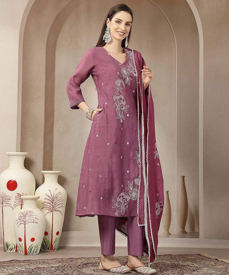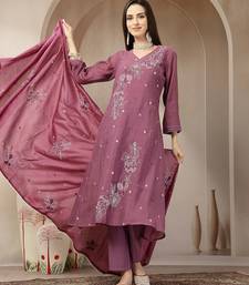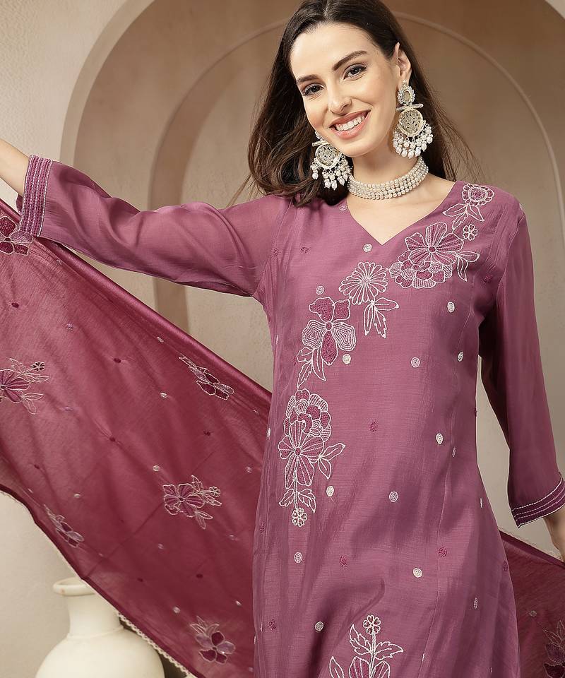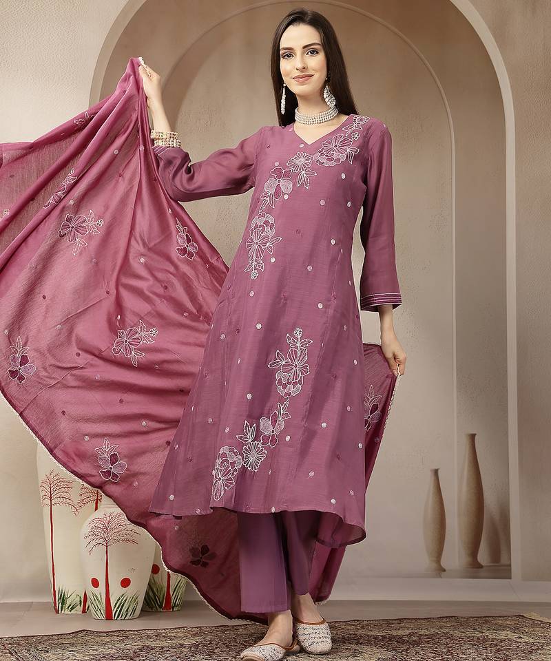 Product Name Purple Mul Chanderi Kantha Work Kurta Dupatta Pant Set