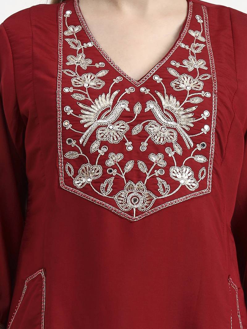 | Product Description | Maroon Silk Blend Zari Work,Mirror Work A Line Kurta Palazzo Dupatta Set Two Pocket Kurta Design Zari Work,Mirror Work A Line Shape Have A Lining Three Quarter Sleeves V Neck Calf Length Kurta Straight Him Machine Weave Silk Blend Palazzo Design: Lavender Silk Blend Palazzo Slip On Waist Size & Fit Material & Care Silk Blend |