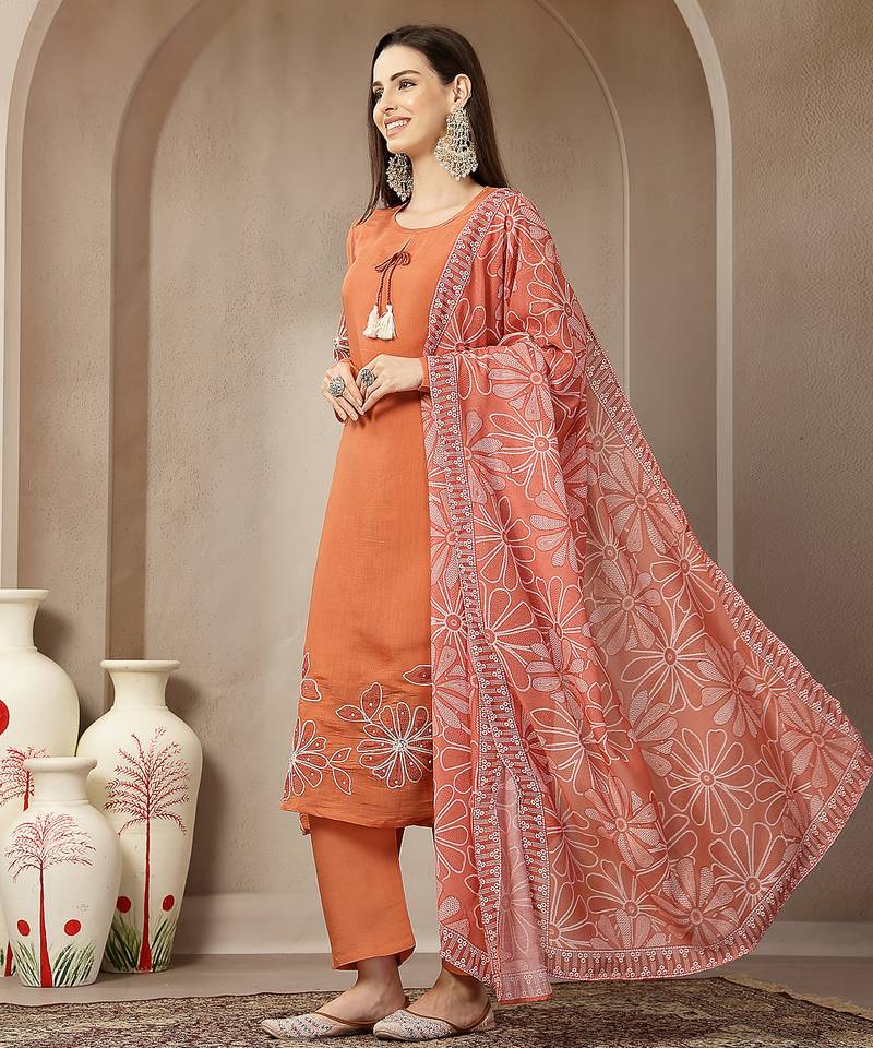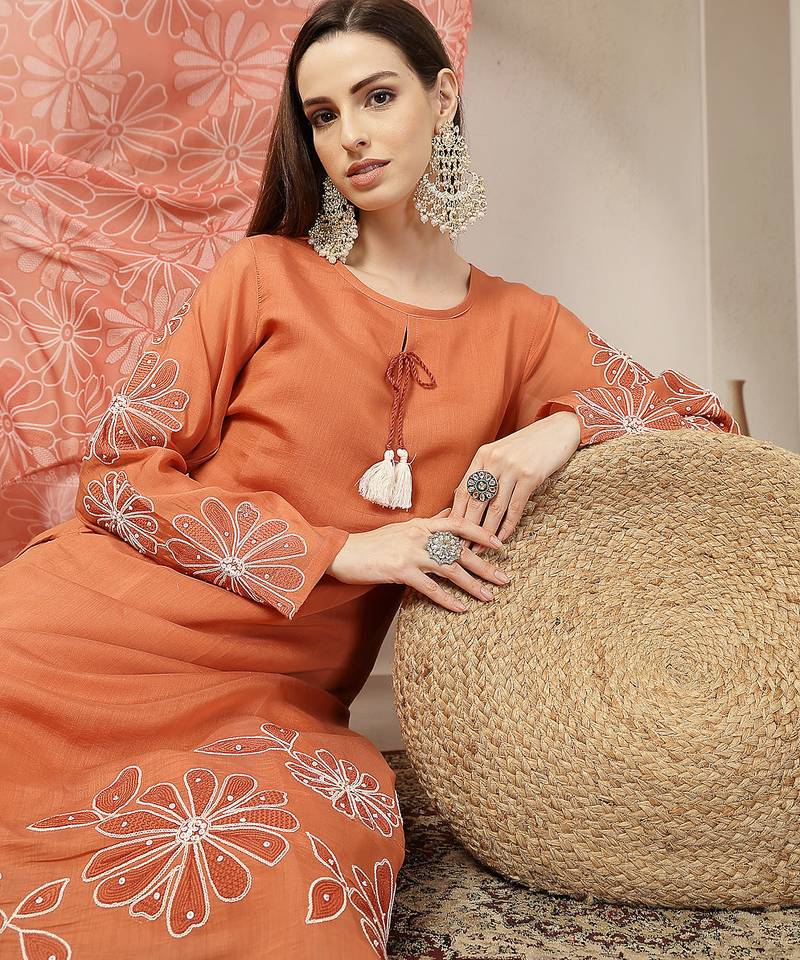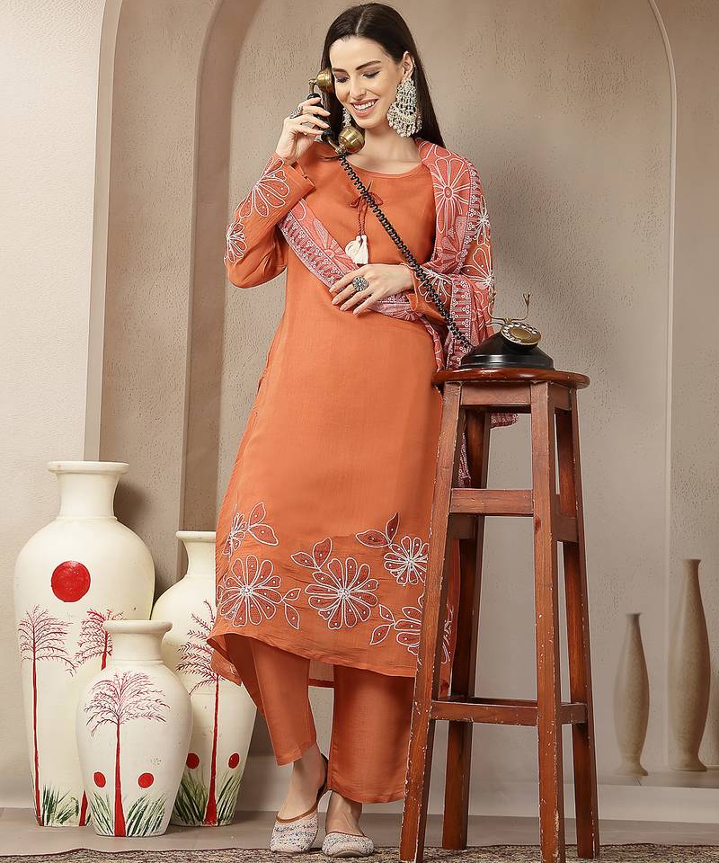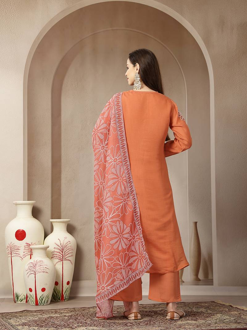 | Product Name | Rust Mul Chanderi Silk Keyhole Neck A Line Kurta Trouser Dupatta Set | |